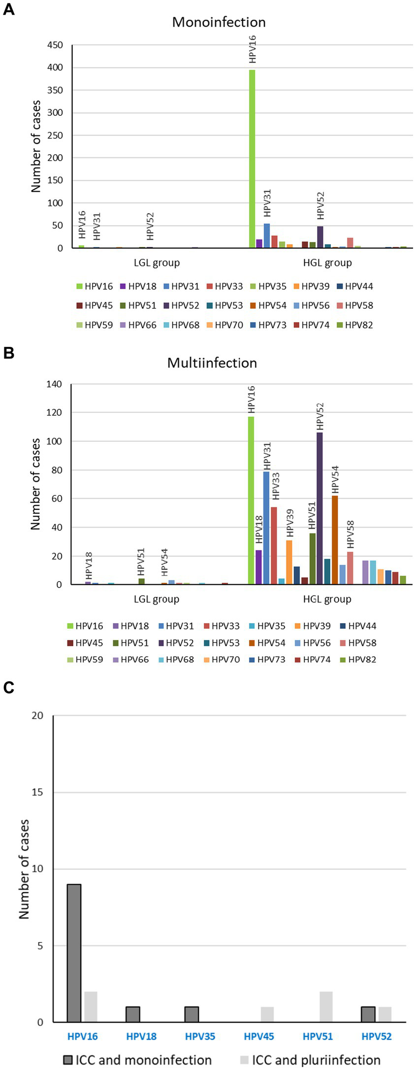 Clinical pathology associated to histrorical samples according to genotype. Genotypes associated to group 2 of lesions, low-grade lesions and high-grade lesions, monoinfection (A) or multi-infection (B); Genotypes associated to group 3 of lesions, ICC, monoinfection and multi-infection (C).