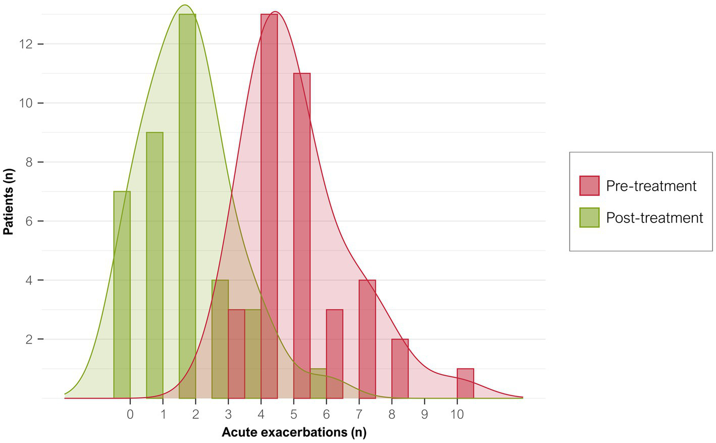Figure 2. Distribution of exacerbations per patient before and after treatment. Graph shows the number of exacerbations in the year before starting azithromycin treatment (red bars) and after 12 months of treatment (green bars).