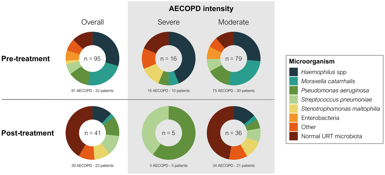 Figure 3. Change of microbiology by AECOPD severity during long-term azithromycin therapy. The number inside each donut chart indicates the number of bacterial isolates. Pre-treatment indicates the year before azithromycin treatment, and post-treatment indicates the first year of azithromycin treatment.