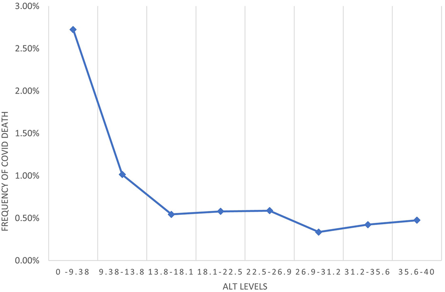 The main finding in this study is that low levels of serum ALT before the disease are associated with higher mortality and longer hospitalizations from COVID-19 infection. Low ALT was a significant predictor of mortality even when controlled for other comorbidities such as age, gender, BMI, hypertension, diabetes mellitus, dementia, stroke, and pulmonary disease, with an OR = 1.88 (p < 0.01) in a logistic regression and a propensity score-matched cohort.