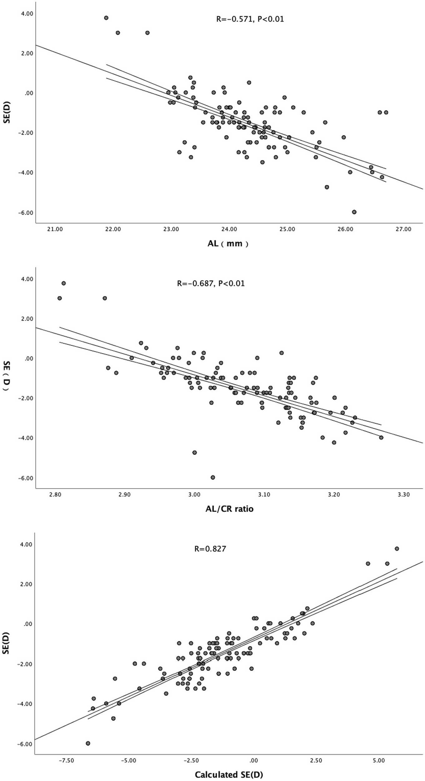 The scatter plots between AL, AL/CR ratio, calculated SE and SE are shown in Figure 2. AL is negatively correlated with SE (r = −0.571, p < 0.01), AL/CR is negatively correlated with SE (r = −0.687, p < 0.01), and calculated SE is positively correlated with SE (r = 0.827, p < 0.01).
