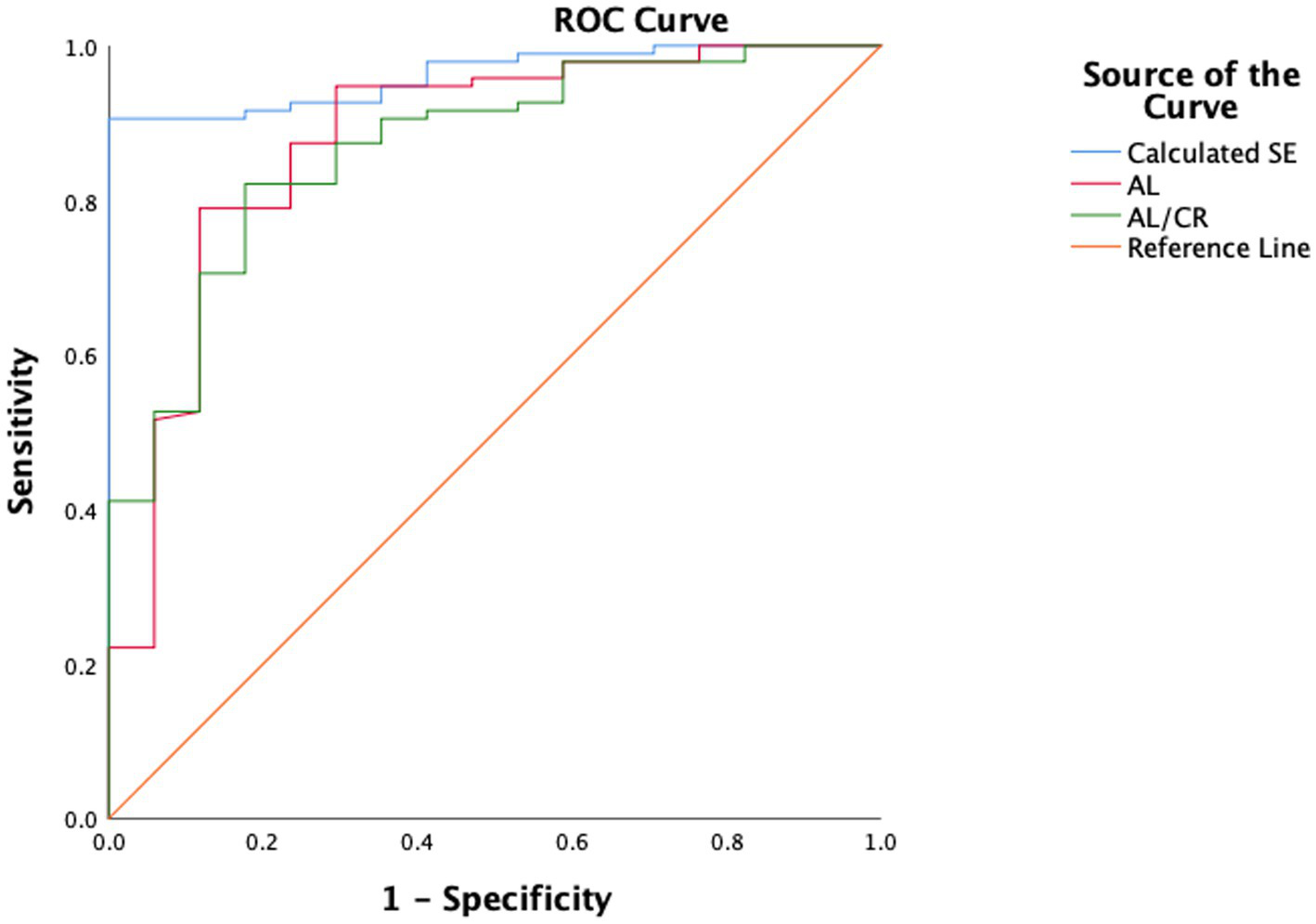 The number of cases judged as myopia or not based on SE, AL/CR, and Calculated SE are shown in Tables 1, 2. The sensitivity, specificity, accuracy, and Youden index of AL/CR were 84.2, 70.6, 82.1%, and 0.548, respectively. The false-positive rate and missed diagnosis rate were 29.4 and 15.8%, respectively. The positive predictive value was 94.1%, the negative predictive value was 44.4%, and the positive and negative likelihood ratios were 2.86 and 0.22, respectively. The sensitivity, specificity, accuracy, and Youden index of Calculated SE were 83.1, 100, 85.7%, and 0.831, respectively. The false-positive rate and missed diagnosis rate were 0 and 16.9%, respectively. The positive predictive value was 100%, the negative predictive value was 51.5%, and the positive and negative likelihood ratios were infinite and 0.17, respectively.