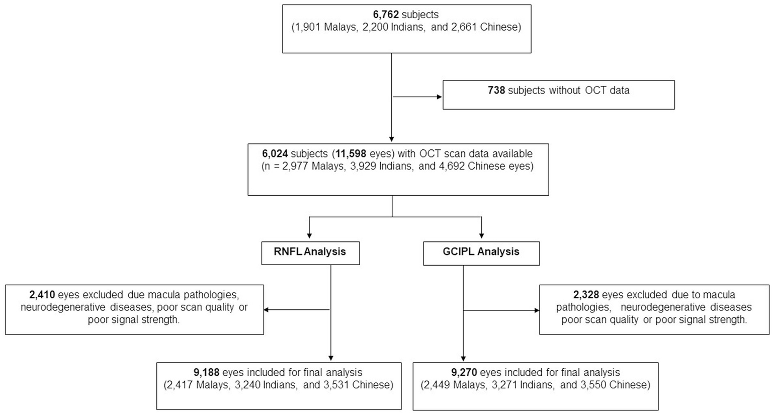 Of the total 6,762 participants, 6,024 participants (11,598 eyes) had OCT scans done. After the exclusion of poor quality scans and retinal diseases which affect RNFL and GCIPL thickness, 9,188 eyes (2,417 Malays, 3,240 Indians, and 3,531 Chinese) were included for final peripapillary RNFL analysis and 9,270 eyes (2,449 Malays, 3,271 Indians, and 3,550 Chinese) for GCIPL analysis (Figure 2). The mean age of participants was 61.5 ± 8.5 years, and of them 51.8% were females (Table 1). The proportions of participants with systemic comorbidities were as follows: 28.2% of the participants had diabetes mellitus; 65.6% of the participants had hypertension; 8.8% of the participants had chronic kidney disease; and 8.8% of patients had CVD—of which, 2.0% had a stroke (27 Malays, 44 Indians, 34 Chinese), 5.3% had MI (80 Malays, 144 Indians, 54 Chinese), and 2.6% had angina (18 Malays, 90 Indians, 29 Chinese; Table 1).