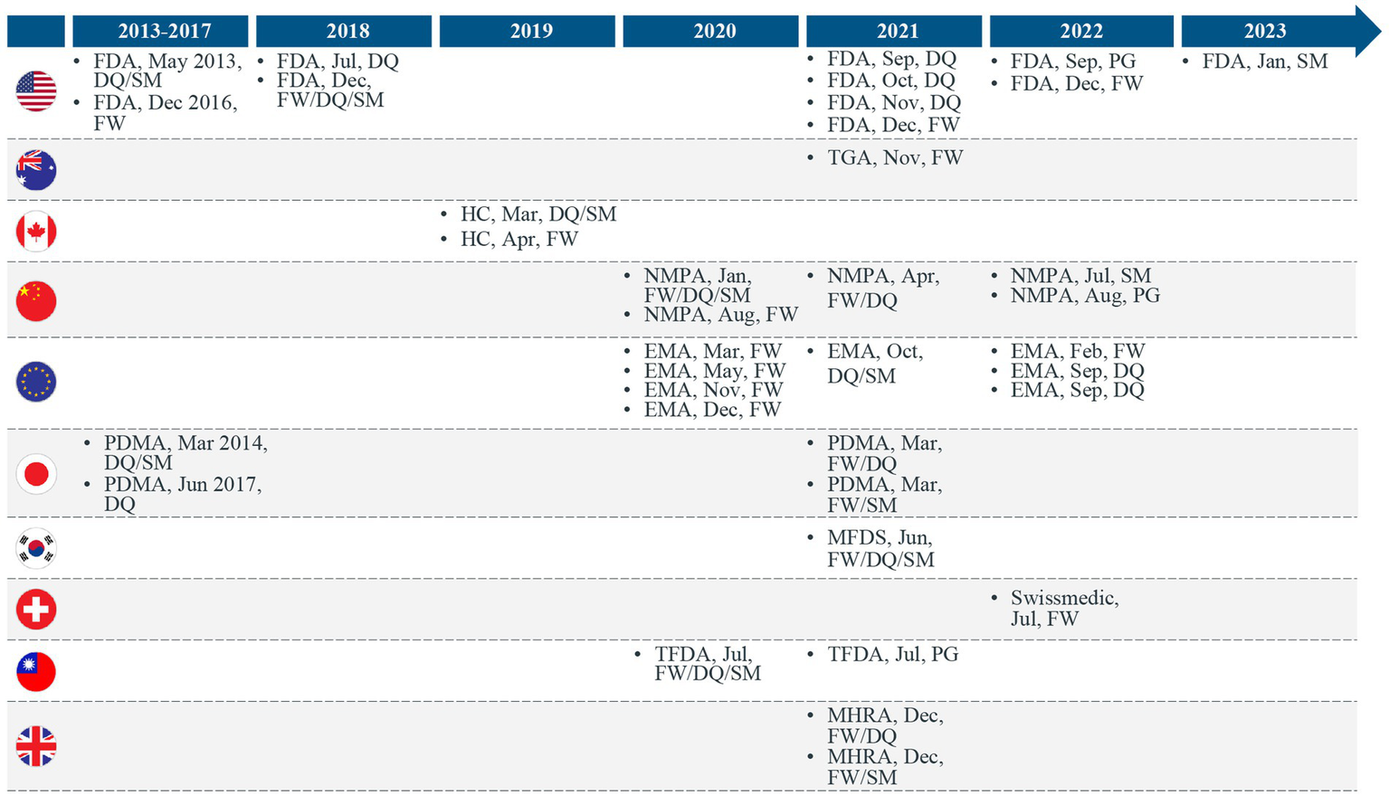 Trends in regulatory real-world evidence (RWE) guidance documents released across the world. EU, European Union; FDA, Food and Drug Administration; HC, Health Canada; FW, Framework; DQ, Real-world data quality guidance; MHRA, Medicines and Healthcare products Regulatory Agency; MFDS, Ministry of Food and Drug Safety; NMPA, National Medical Products Administration; PG, Procedural Guidance; PMDA, Pharmaceuticals and Medical Devices Agency; SM, Real-world study methods guidance; TFDA, Taiwan Food and Drug Administration; TGA, Therapeutic Goods Administration.