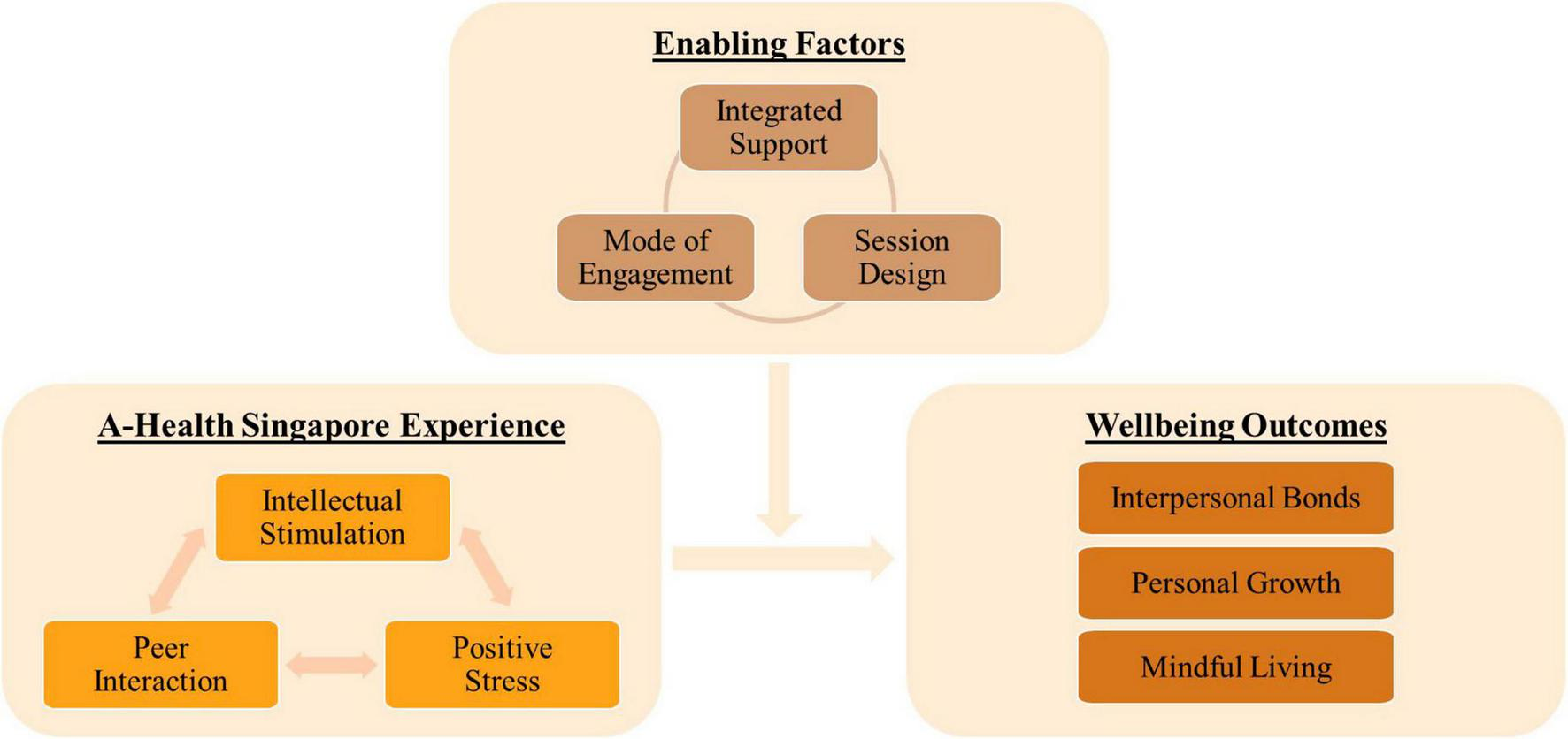 Descriptive analyses of the program evaluation survey data revealed that 96.2% of participants were satisfied with the overall experience of the Singapore A-Health intervention (M = 9.00, SD = 1.76), reported that the intervention positively impacted their quality of life (M = 8.90, SD = 1.43), and social wellbeing (M = 8.92, SD = 1.43). Thematic analysis with a grounded theory approach on the qualitative focus group data revealed three interrelated themes detailing how the Singapore A-Health Intervention contributed to positive health and wellbeing outcomes (1. A-Health Experience, 2. Wellbeing Outcomes, 3. Enabling Factors) and nine subthemes (1a. Intellectual Stimulation, 1b. Positive Stress, 1c. Peer Interaction, 2a. Interpersonal Bonds, 2b. Personal Growth, 2c. Mindful Living, 3a. Integrated Support, 3b. Session Design, 3c. Mode of Engagement).
