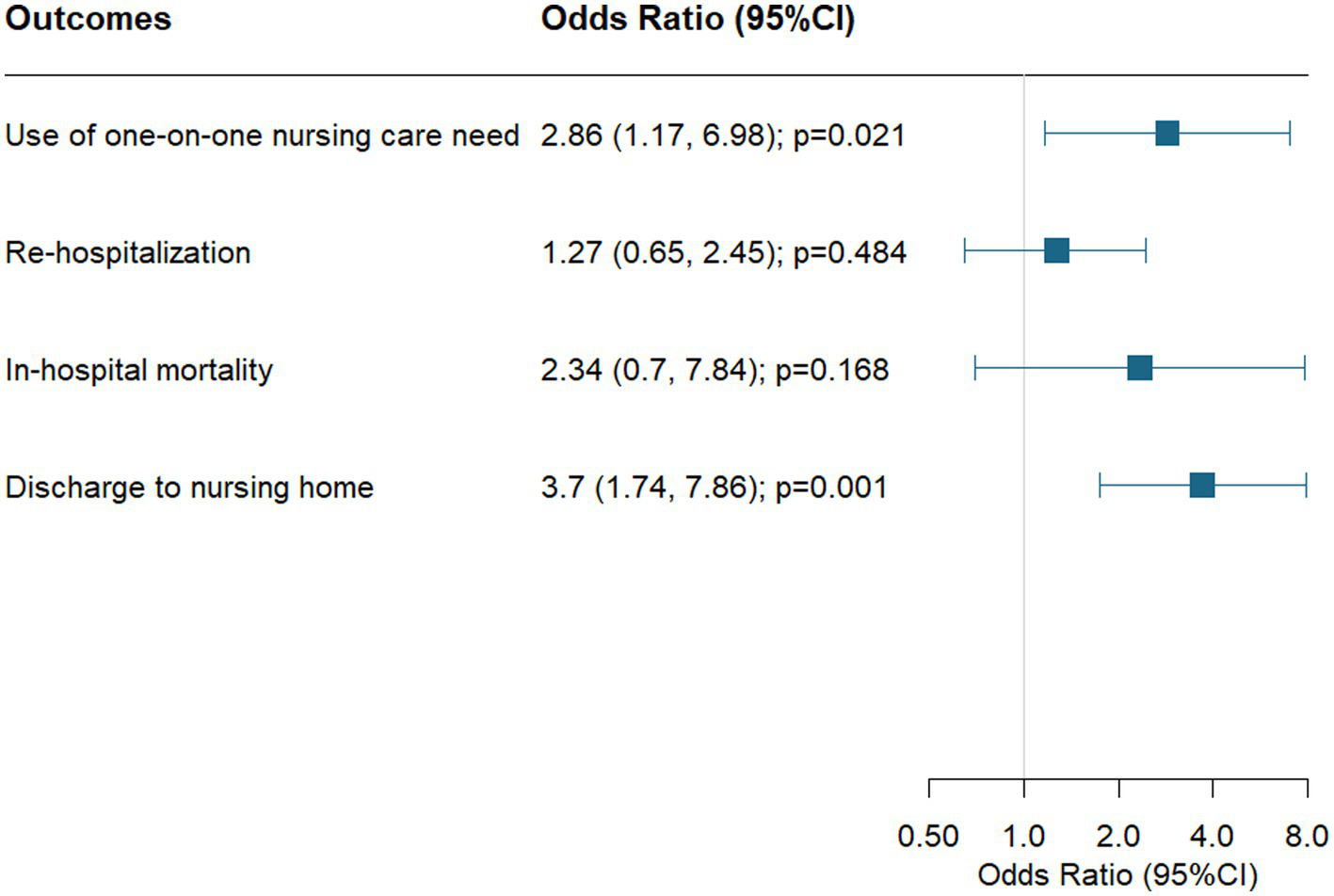 For pilot study 2, logistic regression analyses were used for four categorical outcomes as dependent variables: (1) need of one-on-one nursing care, (2) re-hospitalization within 30 days, (3) in-hospital mortality, and (4) discharge to a nursing home (among patients admitted from home). Odds ratios (ORs) with 95% confidence intervals (CI) were calculated, after adjusting for age and sex. All data analyses were 2-tailed, with p < 0.05 set as the criterion for statistical significance. Stata Special Edition statistical software version 16.0 (Stata Corp.) was used.