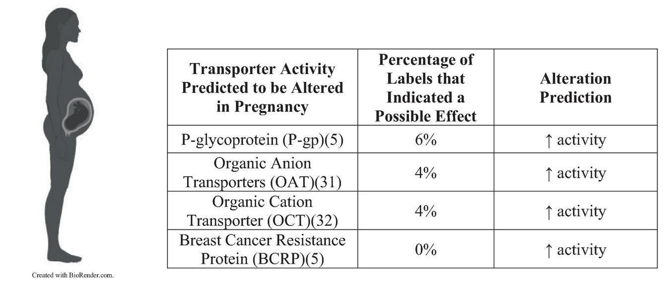 Drug transporters can be expressed within a variety of organ systems, and they can affect pharmacokinetics of a drug if it is a substrate (5). For example, intestinal luminal transporters affect drug absorption from the gastrointestinal tract, hepatic sinusoids control drug uptake into hepatocytes for metabolism, and transporters expressed in the renal cells control reabsorption and tubular secretion. Major drug transporters that are predicted to be altered during pregnancy include P-gp, organic anion transporters (OATs), OCTs, and BCRP (30–32). P-gp is a transporter that acts at multiple sites, including the intestines, hepatocytes, kidney proximal tubules, brain endothelial cells, and placenta (5). If the activity of P-gp is altered, then it will influence the absorption, excretion, and extent of drug transport into target organ systems. P-gp works as an efflux transporter, so an induction of activity will cause there to be less bioavailability if it is a substrate of this transporter. Researchers have assumed that drug transporter expression is altered during pregnancy, but most transporters are not comprehensively studied. Despite a lack of knowledge into pregnancy’s influence over transporters, 6% of the 139 US drug labels were likely influenced by P-gp, 4% to OATs, and 4% to OCTs. More research needs to be focused toward the effects of these transporters because they will likely influence bioavailability and clearance during pregnancy.