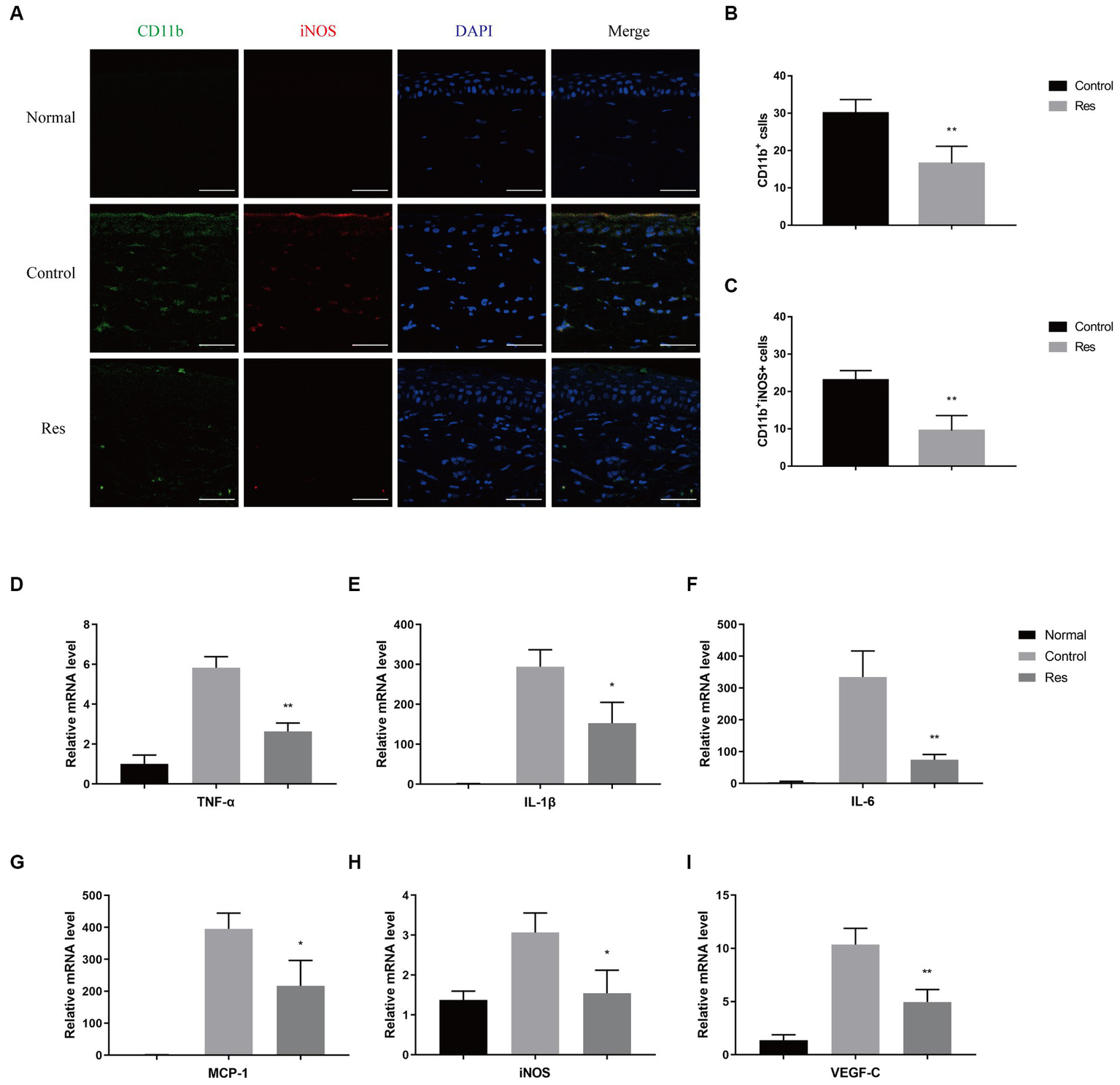 The eyes of rats in the normal, control, and resveratrol groups were removed and fixed with 4% PFA. The tissues were then embedded in paraffin wax and cut into 4 μm thick sections. The sections were stained with mouse anti-cluster of differentiation molecule 11b (CD11b; 1:100, sc-1186; Santa Cruz, CA, United States) and rabbit anti-inducible nitric oxide synthase (iNOS; 1:500, ab283655; Abcam, Cambridge, United Kingdom) primary antibodies at 4°C overnight. Subsequently, they were dyed with Goat anti-Mouse IgG (H + L) Highly Cross-Adsorbed Secondary Antibody (Alexa Fluor Plus 488, 1:200; Invitrogen, Carlsbad, CA, United States) and Goat anti-Rabbit IgG (H + L) Highly Cross-Adsorbed Secondary Antibody (Alexa Fluor Plus 594, 1:200; Invitrogen) for 1 h. The stained slices were analyzed under a Zeiss LSM 880 microscope (Carl Zeiss Meditec, Jena, Germany).
