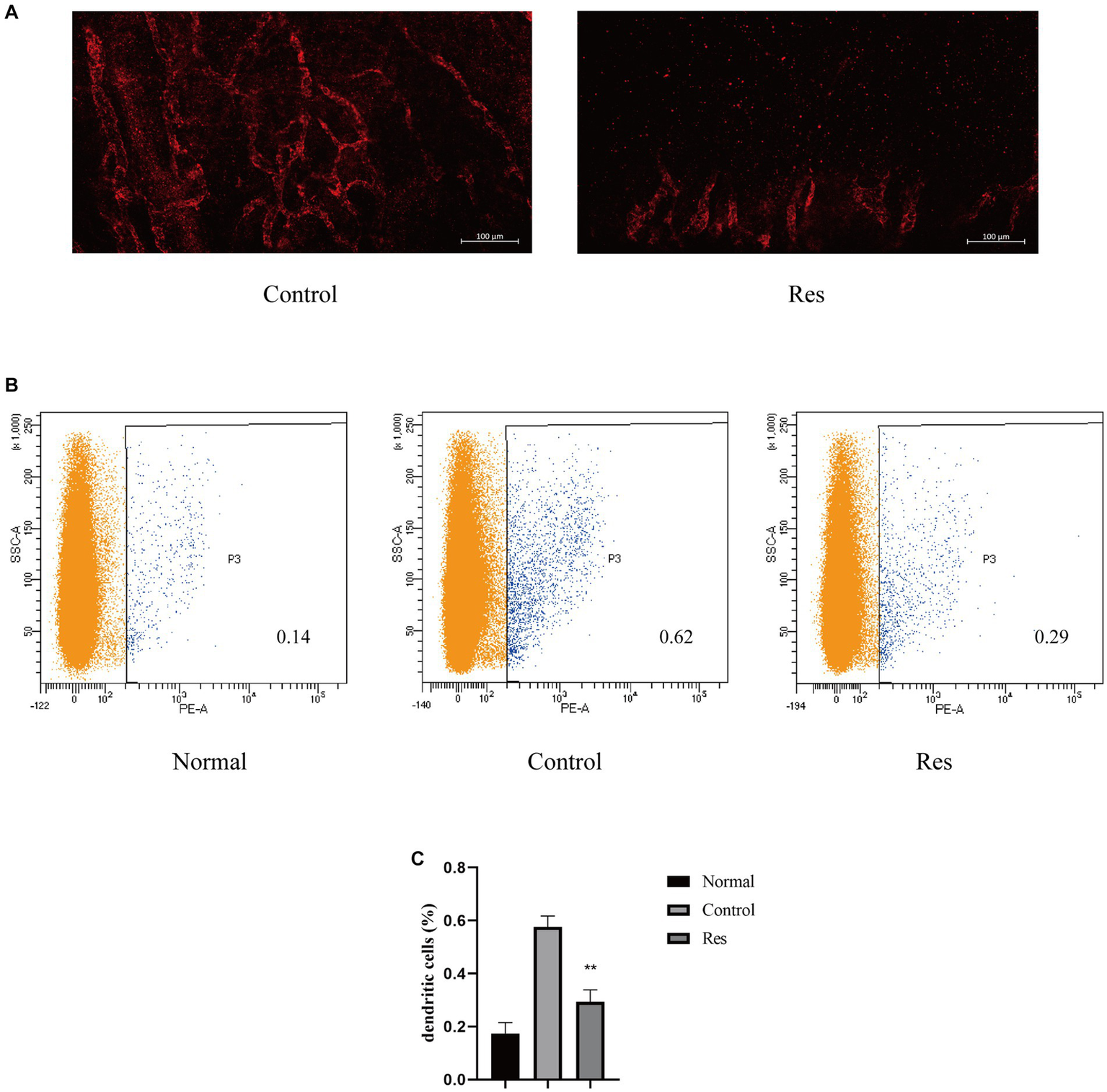 On the 10th postoperative day, the right cervical lymph nodes on the same side as the surgical eyes of the rats in the normal, control, and resveratrol groups were removed and ground. The obtained cells were resuspended using stain buffer and surface-stained with CD103 (Integrin alpha E) Monoclonal Antibody (OX62), PE, eBioscience (12-1030-82, 0.25 μg per test; Thermo Fisher Scientific, Waltham, MA, United States) for 20 min. Analyses were then performed using a BD LSRFortessa flow cytometer (BD Biosciences, San Jose, CA, United States).