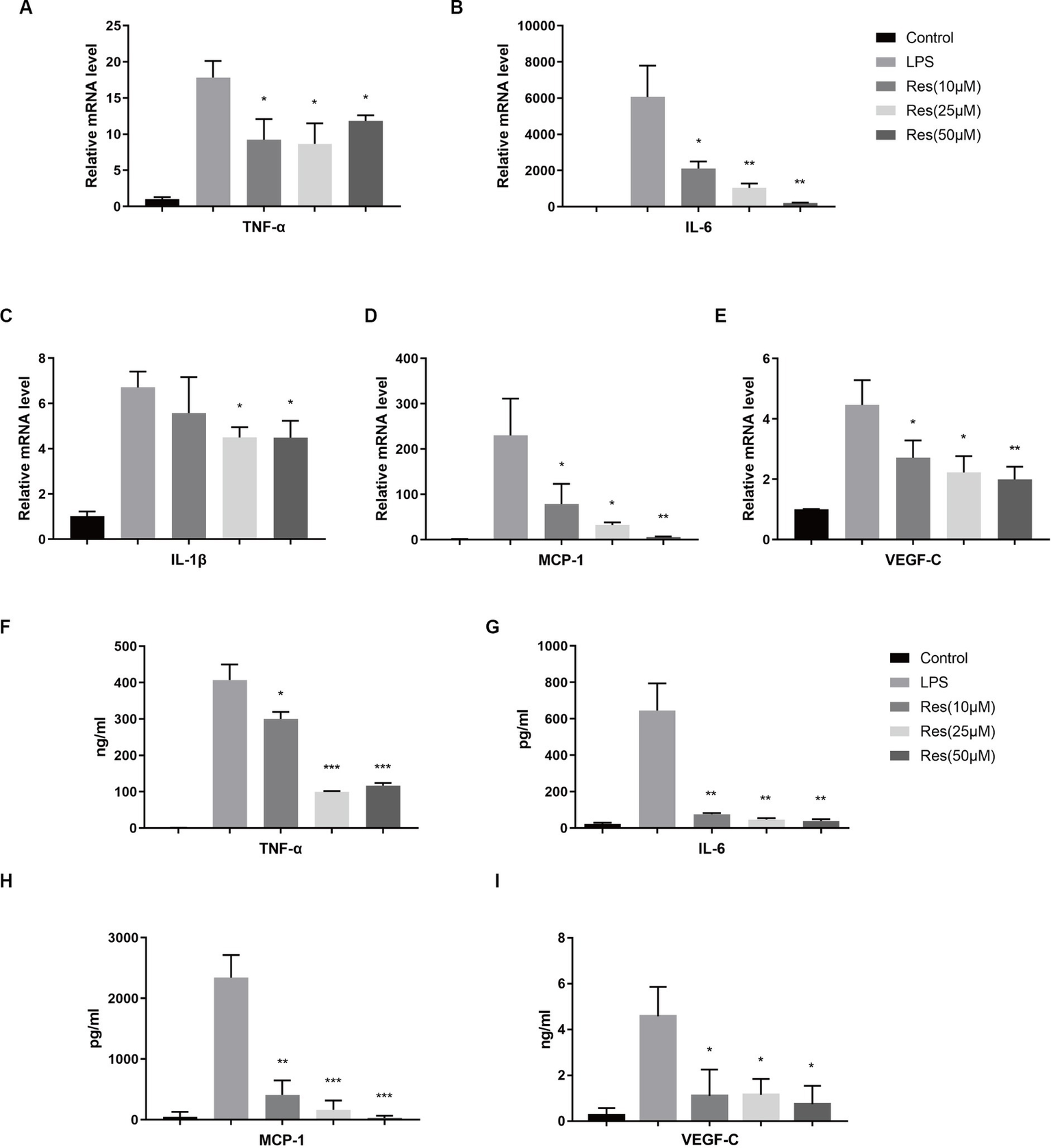 The cells were divided into five groups. The control group consisted of untreated M0 macrophages. The cells in the LPS group were treated only with LPS. The cells in the resveratrol groups were treated with three resveratrol concentrations: 10, 25, and 50 μM.