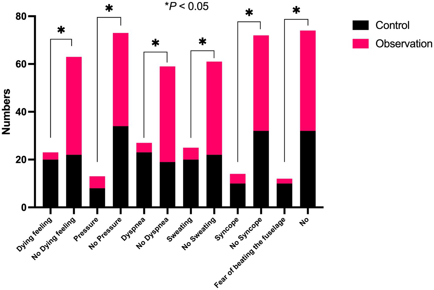 The patients in the observation group had less severe autonomic nervous symptoms than those in the control group during the examination (p < 0.05) (Figure 5).