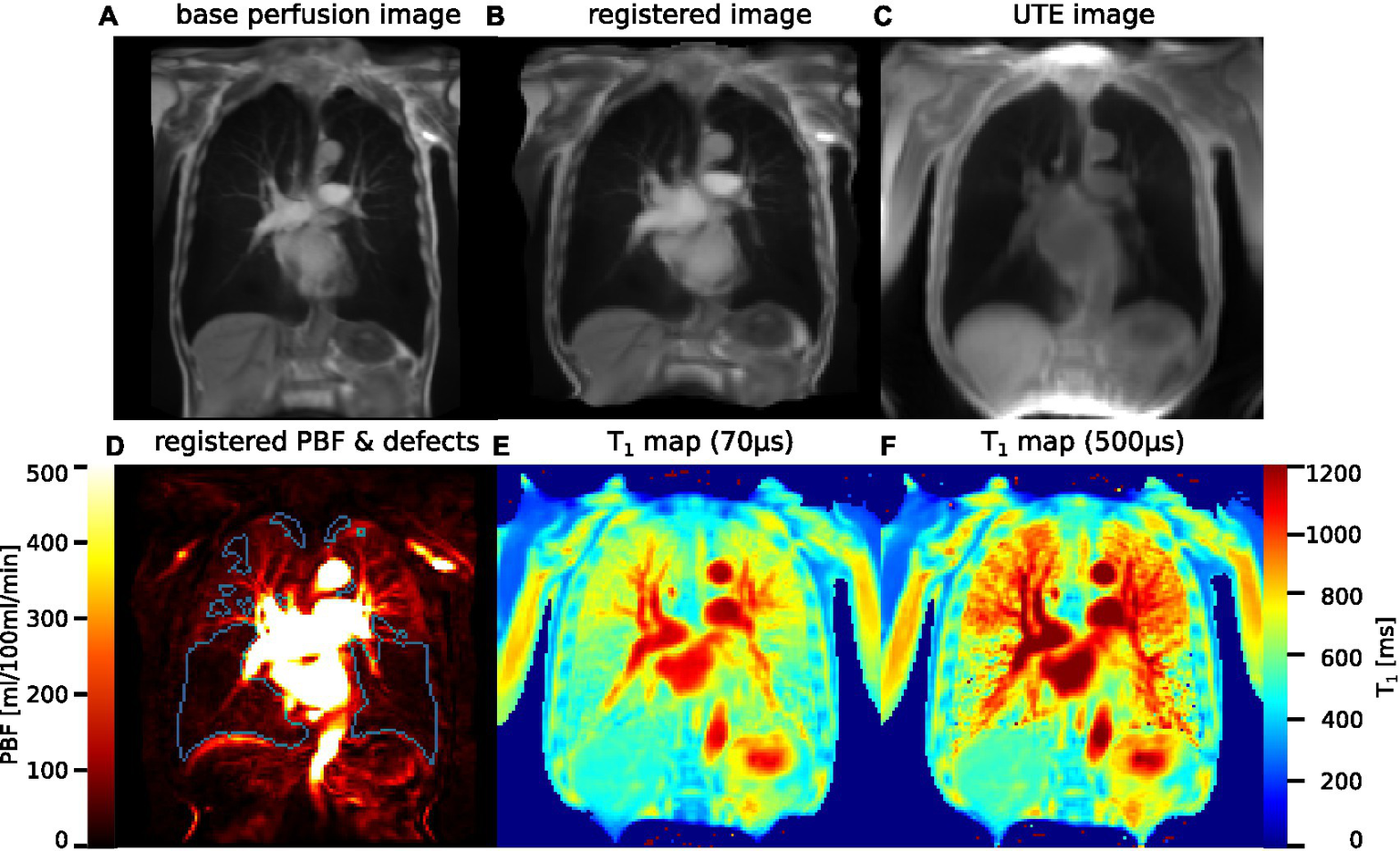 (A) Original image from DCE MRI, averaged over all timepoints and three slices. (B) The same image, registered to the UTE image. (C) Image derived from inversion recovery UTE that was used as registration target. (D) PBF map after application of the distortion field produced by the image registration, with perfusion defects delineated in blue. (E) T1 map acquired using UTE at TE1 = 70 μs. (F) T1 map at TE2 = 500 μs.