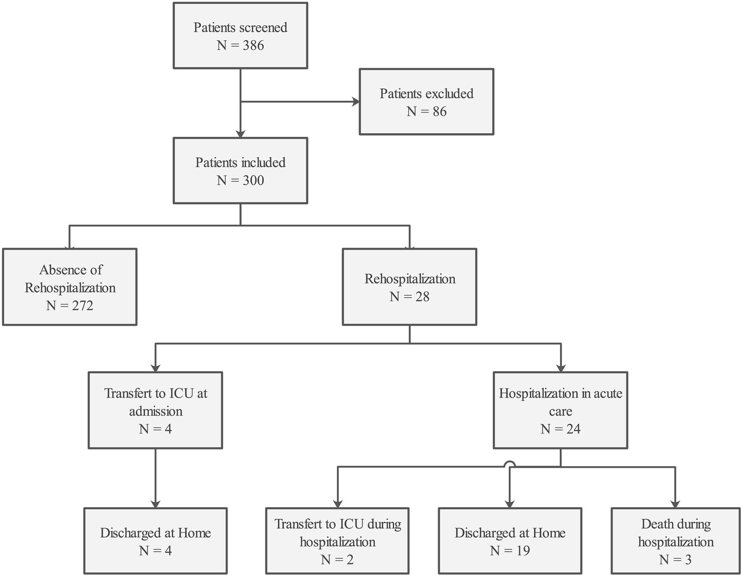 We performed a univariable analysis to identify factors associated with unplanned rehospitalization. In this analysis, factors significantly associated with rehospitalization were age, chronic respiratory failure, delay from symptoms onset, and telemonitoring.