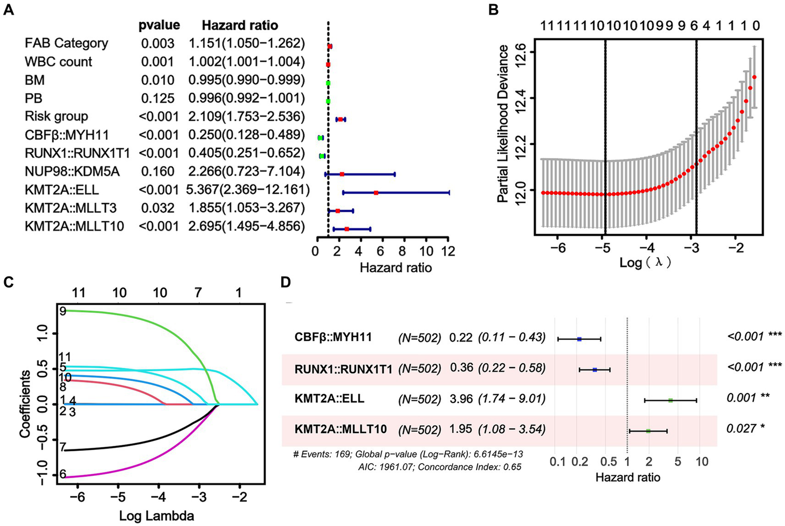 Using LASSO regression, a predictive model was created from 11 survival-related factors based on the results of the univariate Cox regression. The model selected 10 survival-related factors with non-zero coefficients, following the minimum criteria (Figures 2B,C). Among them, 6 survival-related fusion genes (CBFβ::MYH11, RUNX1::RUNX1T1, NUP98::KDM5A, KMT2A::ELL, KMT2A::MLLT3, and KMT2A::MLLT10) were inspected with multivariate Cox regression analysis. Eventually, based on the minimum Akaike information criterion (AIC) value, a risk model was obtained using four fusion genes (CBFβ::MYH11, RUNX1::RUNX1T1, KMT2A::ELL, and KMT2A::MLLT10), of which, CBFβ::MYH11 and RUNX::RUNX1T1 were potential protective genes and KMT2A::ELL, and KMT2A::MLLT10 were potential risk genes (Figure 2D). We then obtained risk scores for the fusion genes, which are presented in Table 4.