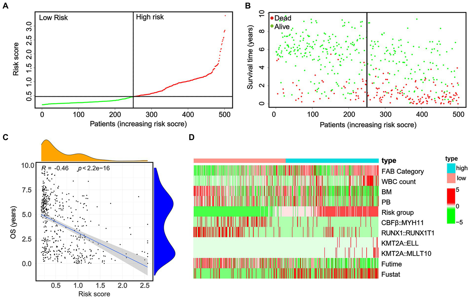 In recent years, many studies have developed risk-scoring systems to assess the prognosis of AML. One example is the score established by Schnittger et al. (13), which is based on the expression level of fusion genes. Their findings indicate that fusion transcript levels at diagnosis have a significant impact on the overall survival (OS) and event-free survival (EFS) of AML. Interestingly, the study by Wang (14) showed that the presence of a TEL/AML-1 fusion gene was statistically significant in predicting both OS and EFS, indicating that TEL/AML-1 is a useful biological variable for risk stratification in future clinical trials. Therefore, we believe that the involvement of fusion genes and clinical characteristics in constructing prognostic assessment models could potentially enhance the accuracy of predicting clinical outcomes for AML patients.