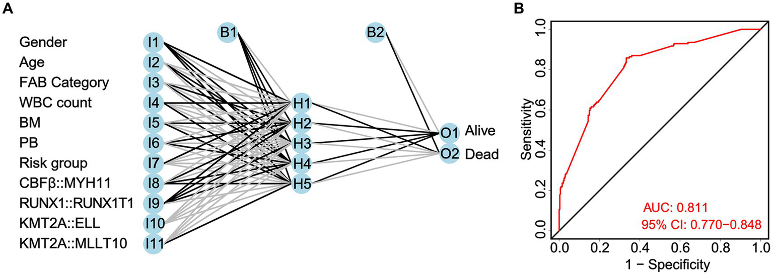 We retrospectively analyzed the clinical data of 184 newly diagnosed non-APL pediatric patients with AML who received continuous treatment at the Children’s Hospital of Zhejiang University School of Medicine (Hangzhou, China) from January 2015 to December 2020 to construct the predictive model. Treatment was performed according to the modified NPCLC-AML97 protocol (15). For patients, induction therapy used either daunorubicin/cytarabine (DA) or daunorubicin/cytarabine/etoposide (DAE). When CR was achieved, the same cycle was repeated for non-APL as consolidation therapy. Intensification therapy consisted of three cycles of intermediate- or high-dose cytarabine (ID/HD Ara-C) every other month for all subtypes of AML. During the intervals of ID/HD Ara-C, DA, homoharringtonine/cytarabine (HA), and etoposide/cytarabine (EA) were given alternatively. Maintenance therapy was given monthly by sequential HA, EA, and doxorubicin/paclitaxel (AT) cycles, and ID/HD Ara-C was administered every 6 months. Central nervous system (CNS) prophylaxis was performed with intrathecal chemotherapy alone. Ara-C, methotrexate (MTX), and dexamethasone (DXM) were administered every 2 weeks during induction, every 2 months during the first year, and every 3 months thereafter. The dosing of MTX, Ara-C, and DXM was different according to the age group: <12 months, MTX 5 mg, Ara-C 12 mg, and DXM 2 mg; up to 23 months, MTX 7.5 mg, Ara-C 15 mg, and DXM 2 mg; up to 35 months, MTX 10 mg, Ara-C 25 mg, and DXM 5 mg; ≥36 months, MTX 12.5 mg, Ara-C 30 mg, and DXM 5 mg. The total course was 2.0 (girls)–2.5 (boys) years from CR. The last date for follow-up was on 31 March 2022, and the median time for follow-up was 2.16 years, ranging from 0.63 to 4.14 years. This study was approved by the Ethics Committee of the Children’s Hospital of Zhejiang University (Approval number: 2022-IRB-130).