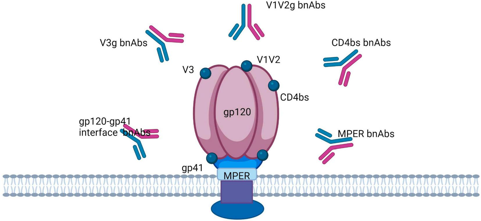 Broadly neutralizing antibodies target the HIV trimer Env in five regions: the CD4 binding site (CD4bs), V1/V2-binding sites, V3-glycan, glycoprotein (gp)41/gp120 interface, and the membrane proximal external region (MPER).