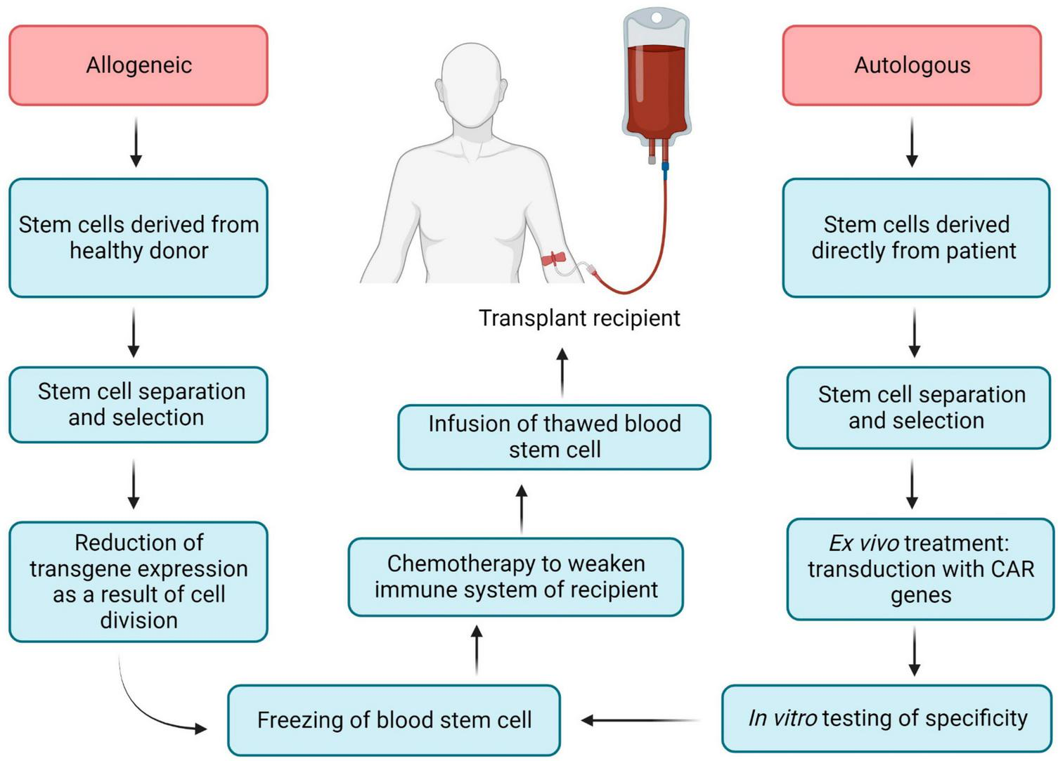 Hematopoietic stem cells (HSCs) perform two important functions: their ability to self-renew and the ability to differentiate into various hematopoietic lines, including lines that have the ability to kill HIV-infected cells (T-cells and NK-cells) (181). Hematopoietic stem cell transplantation (HSCT) has become a promising candidate for achieving a functional cure for HIV, mainly due to the clinical experience of the Berlin patient and the London patient (182–184). Both patients received HSPCs from donors with a naturally occurring 32 base pair deletion in the CCR5 gene corresponding to the second extracellular loop of the receptor (CCR5Δ32), resulting in a non-functional gene product that is not expressed on the cell surface due to frameshift and early termination (185, 186). The stable viral remission in these patients after cART interruption is presumably explained by a combination of a conditioning regimen that provided donor chimerism, destruction of host latent reservoirs during donor cell engraftment and almost full substitution of the host immune system by homozygous CCR5Δ32 donor cells (187–189). While the positive outcomes of these two patients’ therapies constitute a significant landmark in the effort to cure HIV, this method includes several limitations (risk of morbidity and mortality, limited prevalence of CCR5Δ32 donors, HIV mutation via a CCR5- to CXCR4 tropism shift) (16, 190). These limitations make allogeneic HSCT unfeasible for the vast majority of people living with HIV (187). HIV-specific CAR expression from genetically modified autologous HSPCs has the potential to bypass the limitations of the allogeneic HSCTs. Previously CD4ζ based CAR-modified HSPCs were differentiated into functional T-cells as well as NK cells in vivo in humanized mice, moreover, these cells are HIV-resistant (191). In addition, NK-cells can identify and eliminate HIV-infected signals using the mechanism of antibody-dependent cell-mediated cytotoxicity (ADCC) (191, 192). Novel genetically modifying HSPCs to express CD4 CAR are long-lived and proliferate in multiple tissues relevant to HIV infection and cancer (lymphoid germinal centers, brain, and gastrointestinal tract) for almost 2 years and have demonstrated multiphasic engraftment in macaques (187). All commercially accessible adoptive T-cell therapies have been autologous (cells derived directly from the patient), as the allogeneic approach has been shown to be complex to design through early HLA typing and stem cell technology (193).