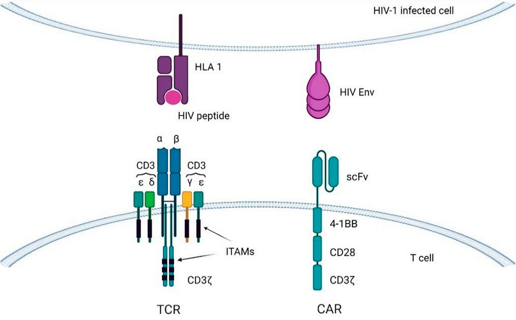 T-cells with CARs or transgenic TCRs targeting viral antigens displayed on HIV-infected cells. Immunoreceptor tyrosine-based activation motifs (ITAMs) are signaling motifs for adaptive immune responses regulation. CAR, chimeric antigen receptor; TCR, T-cell receptor; HLA, human leukocyte antigen.