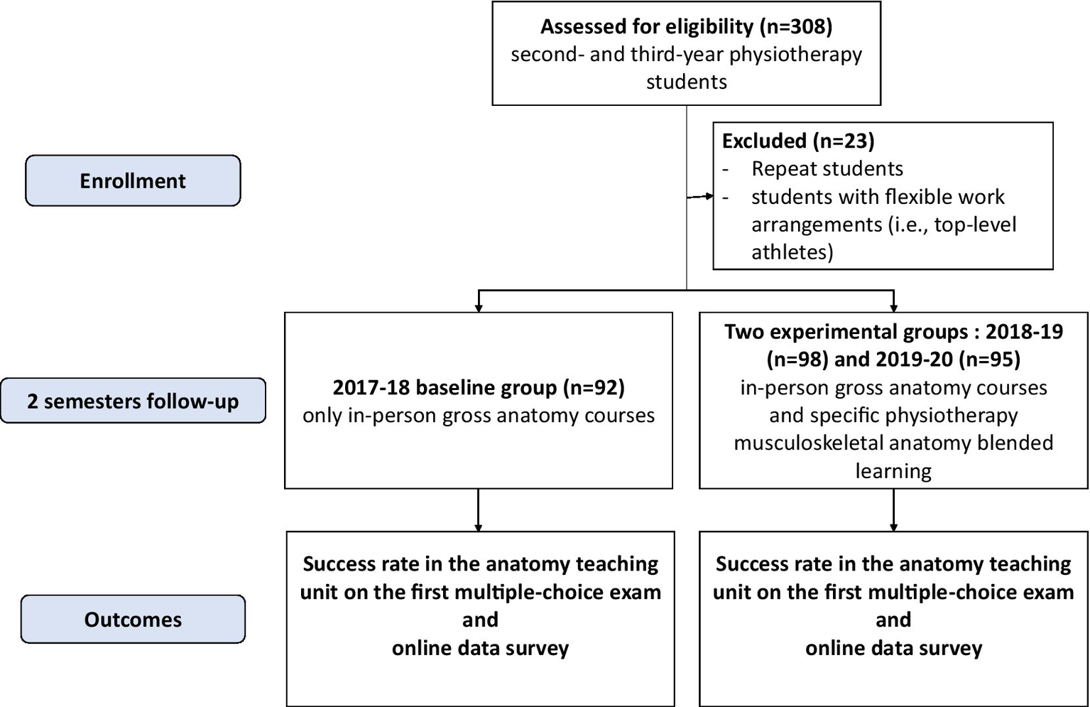 A baseline group (2017–18 baseline group) was formed of second-year physiotherapy students who attended only in-person gross anatomy courses with no specific physiotherapy musculoskeletal blended learning in anatomy (from September 2017 to July 2018).