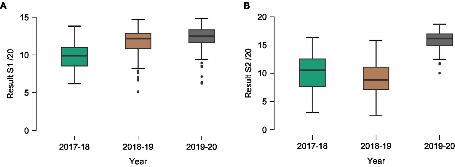Mean result and standard deviation of students for first (A) and second (B) semesters in anatomy without (2017–18 baseline group) and with blended learning (2018–19 and 2019–20 experimental groups). S1: first semester; S2: second semester.