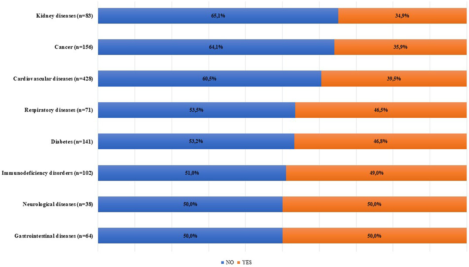 A total of 553 subjects completed the questionnaire, with an 87% response rate. Selected characteristics of the sample are reported in Table 1. The mean age was 66.8 years (± 12.1 SD); 45.6% (95% CI 41.4–49.8) of respondents declared to suffer from three or more NCDs and the most prevalent were cardiovascular illness, including hypertension and heart diseases (77.4, 95% CI 73.7–80.8); cancer (28.2, 95% CI 24.5–32.2) and diabetes (25.5, 95% CI 21.9–29.3). Primary and secondary immunodeficiency disorders due to transplantation, asplenia and immunosuppressive medications were reported by 18.6% (95% CI 15.3–21.9) of respondents. Moreover, when patients were asked to indicate in a 10-point Likert-type scale their perceived health status, 39.2% (95% CI 34.4–42.7) evaluated their health in general as very good or excellent.