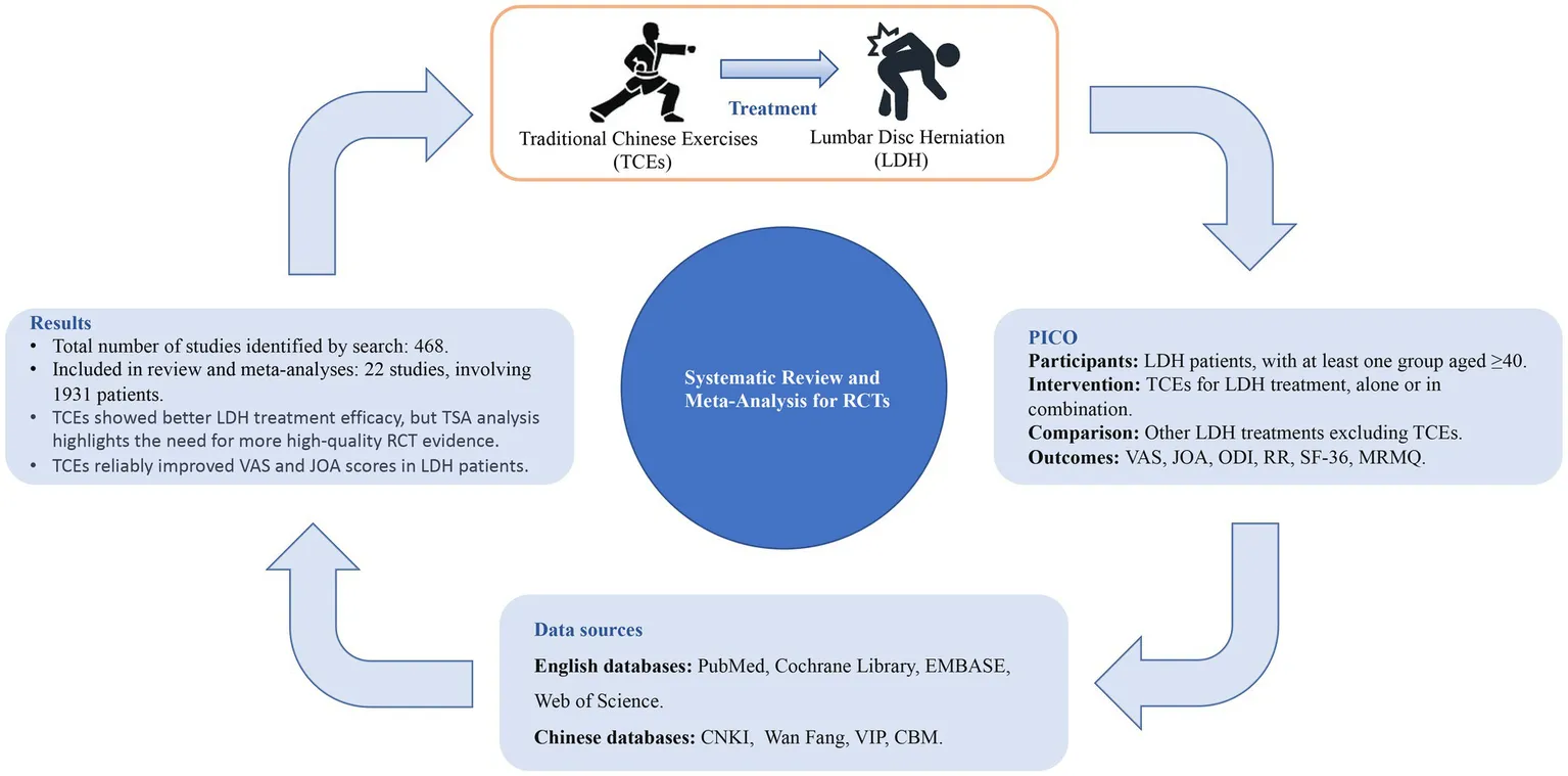 The primary search terms used were (“traditional Chinese exercises” OR “qi gong” OR “Qigong” OR “Tai Chi” OR “tai ji” OR “ba duan jin” OR “Baduanjin” OR “yi jin jing” OR “Yijinjing” OR “Five-animal exercises” OR “wu qin xi” OR “Wuqinxi”) and (“lumbar disc herniation” OR “disc herniation”). To identify additional relevant studies, we examined the reference lists of relevant reviews. The World Health Organization International Clinical Trials Registry Platform (ICTRP) and the Chinese Clinical Trial Registry (ChiCTR) were also searched to identify ongoing or unpublished studies. In case of necessity, the reviewers made direct contact with the authors of the included studies. No restrictions were applied in terms of publication language or status.