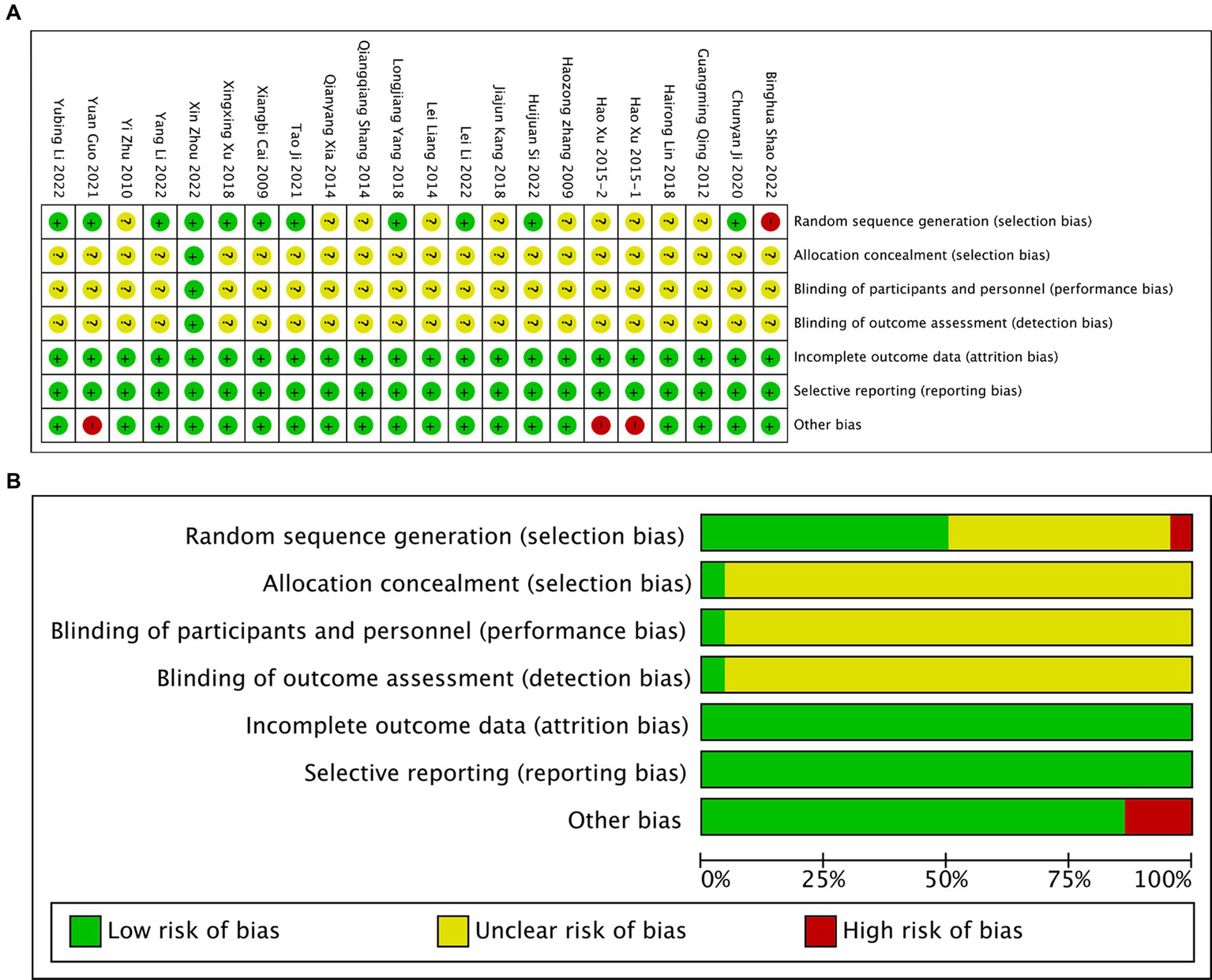 Risk of bias graph. (A) Bias risk for individual studies. (B) Bias risk for all studies.