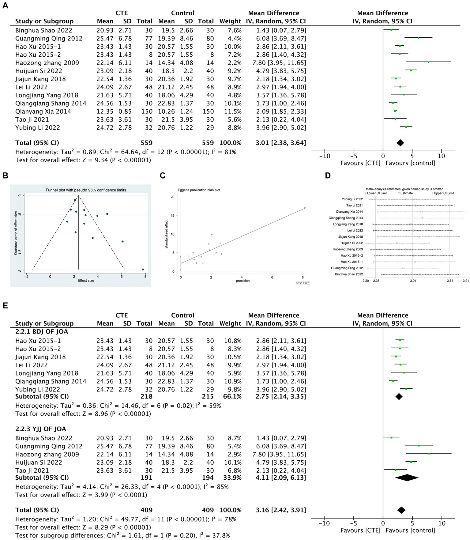 Meta-analysis results graph of JOA scores. (A) Forest plot comparing JOA scores between the treatment group and the control group. (B,C) Funnel plot of publication bias analysis results. (D) Sensitivity analysis results graph. (E) Forest plot of subgroup analysis between BDJ group and YJJ group.
