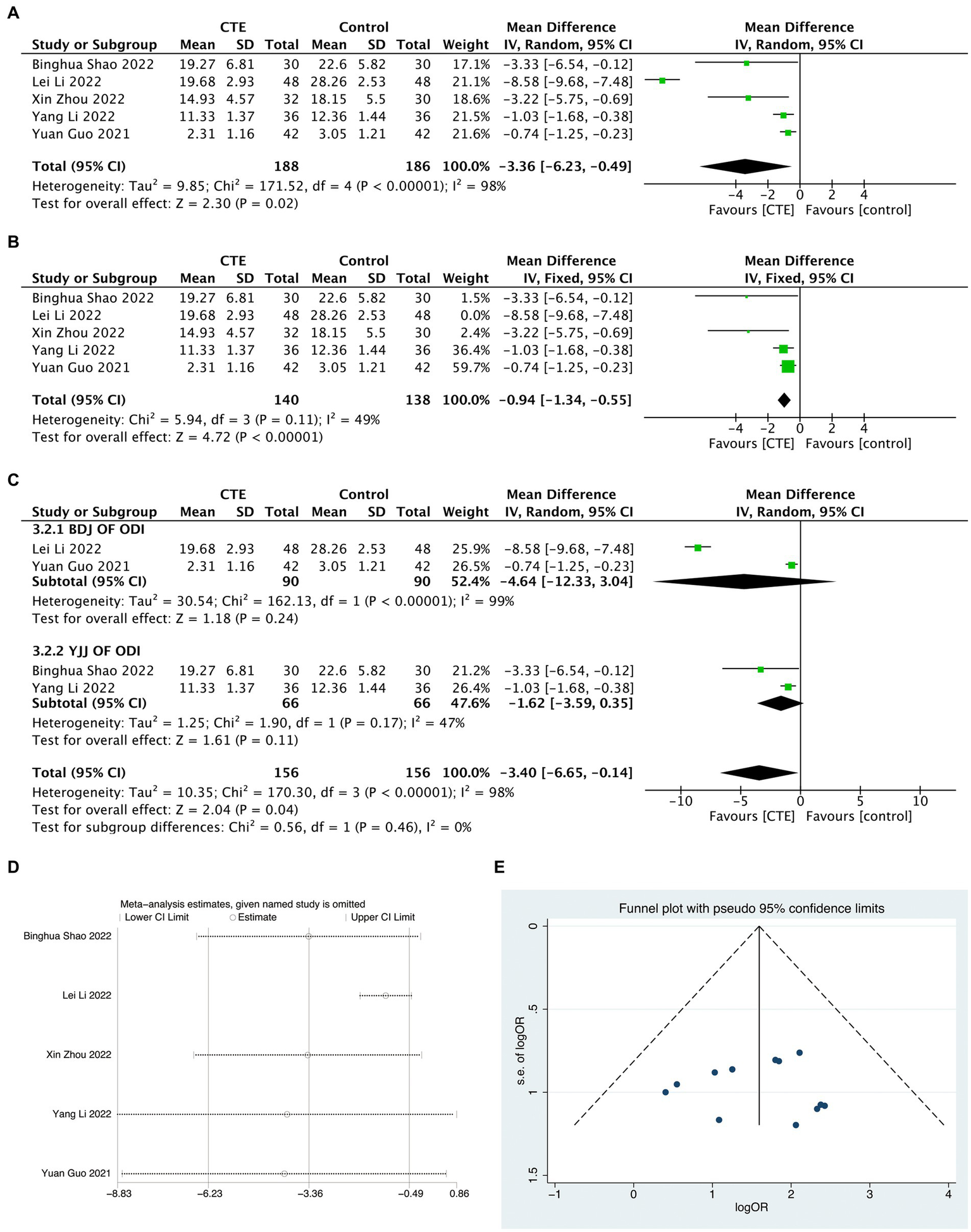 Meta-analysis results graph of ODI scores and response rate. (A) Meta-analysis results graph of ODI scores. (B) Forest plot of ODI scores after sensitivity analysis. (C) Forest plot of ODI scores after sensitivity analysis. (D) Sensitivity analysis results graph of ODI scores. (E) Funnel plot of publication bias analysis results for response rate.