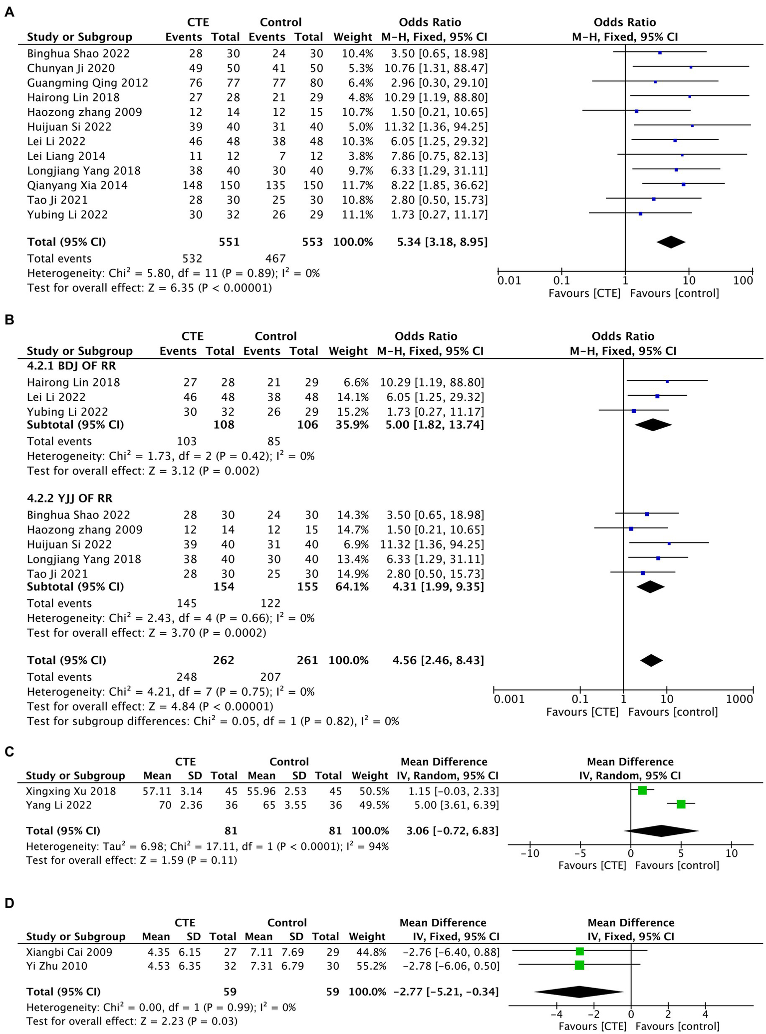 Meta-analysis results graph. (A) Forest plot of meta-analysis results graph for response rate. (B) Forest plot of subgroup analysis for response rate in BDJ group and YJJ group. (C) Forest plot of meta-analysis results graph for SF-36. (D) Forest plot of meta-analysis results graph for MRMQ scores.