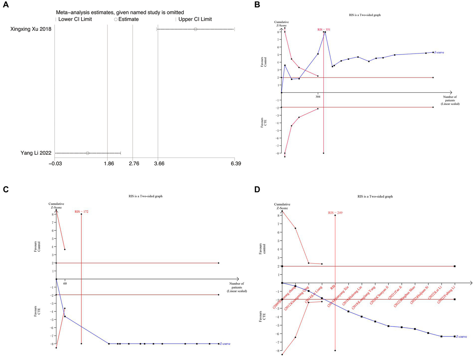 Meta-analysis and TSA analysis results graph. (A) Sensitivity analysis results graph for SF-36 scores. (B) VAS scores TSA analysis results graph. (C) TSA analysis results graph of JOA scores. (D) TSA analysis results graph of response rate.
