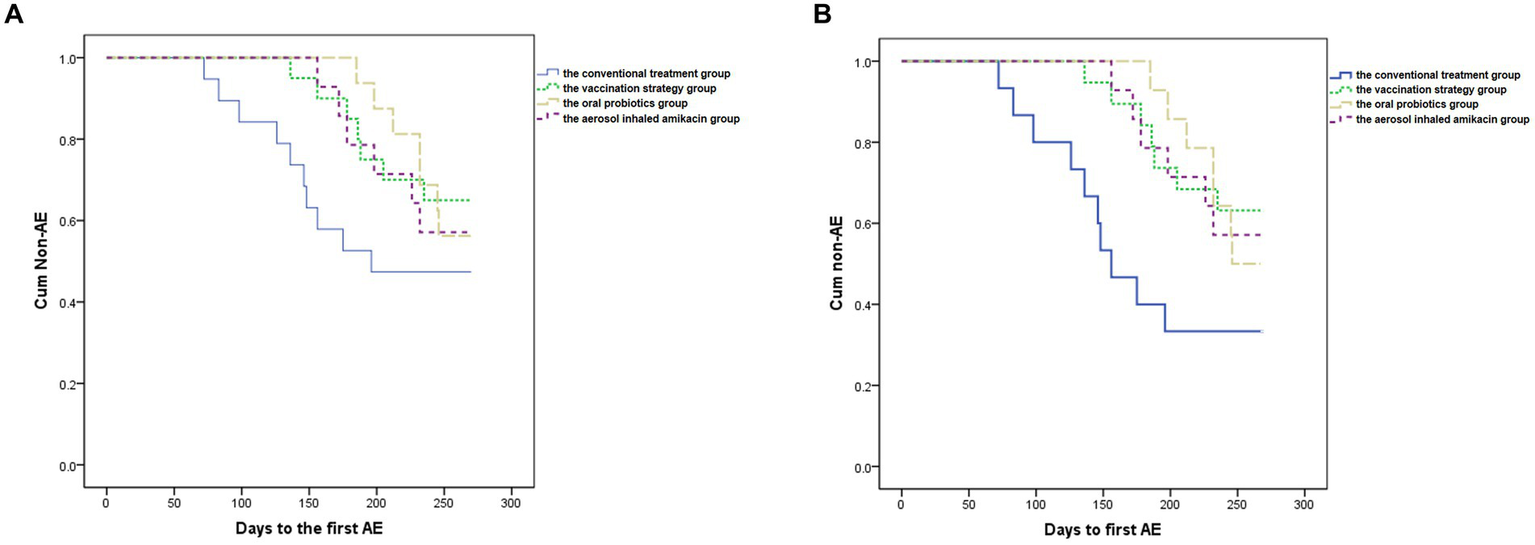 For patients in oral probiotic group, they were additionally given Culturelle™ DIGESTIVE HEALTH 30 CT (VCAP) (10 Billion Claim) which consists of 100% Lactobacillus rhamnosus GG (LGG),1 tablet, q.d., for 3 months (30–32). For patients in aerosol inhaled amikacin group, they were additionally given 0.4 g Amikacin sulfate injection configured with 5 mL saline in the form of aerosol inhalation intermittently for 3 months (b.i.d., 5–7 days per month). In order to observe and cope with adverse events timely, subjects were admitted to the ward during inhaling nebulized amikacin (16, 33–35). For patients in vaccination strategy group, Influenza Vaccine recommended by World Health Organization (WHO) and imported 23-Valent Pneumococcal Polysaccharide Vaccine approved by China Food and Drug Administration (CFDA) were vaccinated by professional nurses (36–39). The two vaccinations were separated by 3–5 days to avoid overlap of adverse events.