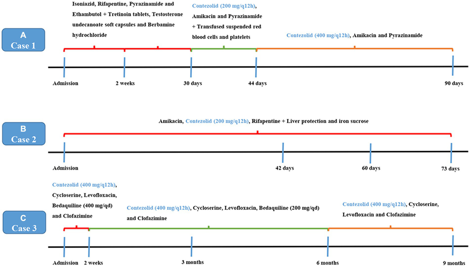 After admission, isoniazid, rifapentine, pyrazinamide, and ethambutol were given anti-TB treatment again. Tretinoin tablets, testosterone undecanoate soft capsules, and berbamine hydrochloride were given treatment after a hematology consultation. After 2 weeks of treatment, the patient’s body temperature was lower than before, and his cough and sputum were better than before. The blood routine examination showed that WBC was 1.50 × 109/L, HGB was 76 g/L, and PLT was 50 × 109/L. After continuing the above treatment for 30 days, a reexamination of the blood routine showed that the WBC was 1.10 × 109/L, HGB was 57 g/L, and PLT was 37 × 109/L. Considering that the reduction of patients’ three cell lines was related to rifapentine and isoniazid, the use of anti-TB drugs was discontinued. Then, he was given contezolid (200 mg/q12h, orally), amikacin (0.4 g/qd, intravenously), and pyrazinamide (0.5 g/q8h, orally) treatment, while also being given transfusing suspended red blood cells and platelets. After 2 weeks of treatment (day 44), the patient’s body temperature returned to normal, and a reexamination blood routine showed that the WBC was 2.10 × 109/L, HGB was 67 g/L, and PLT was 77 × 109/L. Other therapies were not changed, and the dosage of contezolid was increased to 400 mg/q12h. There were also no more platelets or blood transfusions. On the 90th day of treatment, the patient’s temperature was normal, and he had no notable cough or sputum production. The blood routine examination showed that the WBC was 2.50 × 109/L, HGB was 77 g/L, and PLT was 67 × 109/L. The result of the Mycobacterium sputum culture was negative. The chest CT showed that the right lung consolidation shadow was significantly improved and the right pleural effusion was basically absorbed (Figure 1B). The administration process is shown in Figure 2A.