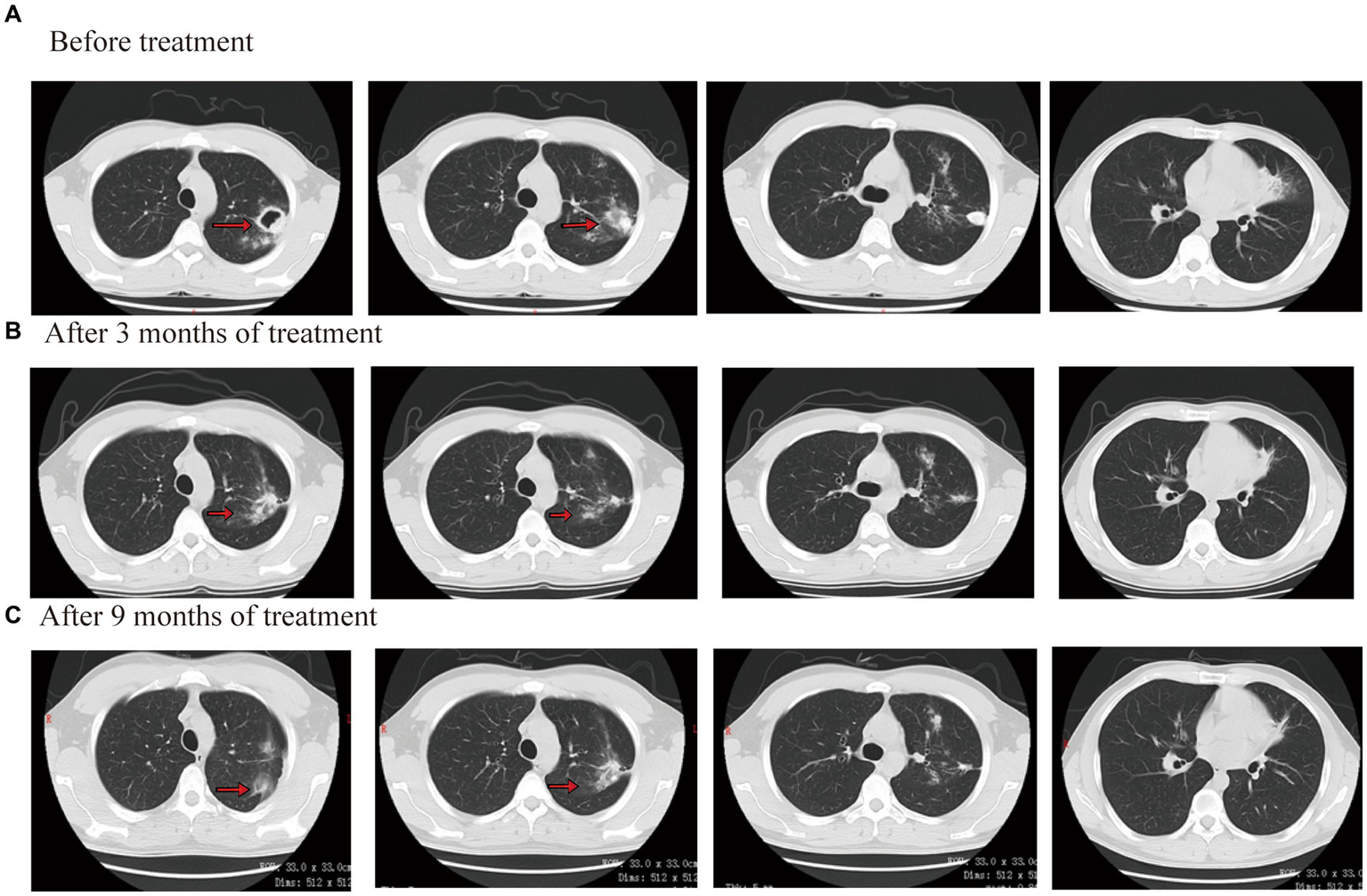 Considering that the patient underwent liver transplantation, some drugs were avoided as much as possible. The patient completed a cycloserine psychological assessment. Contezolid (400 mg/q12h, orally), cycloserine (0.25 g/bid, orally), levofloxacin (0.6 g/qd, orally), bedaquiline (400 mg/qd, orally), and clofazimine (100 mg/qd, orally) were given. Bedaquiline was changed to 200 mg/tiw after 2 weeks. The patient’s body temperature returned to normal, symptoms of cough and sputum improved, and numbness and pain in both lower limbs were relieved by approximately 70%. After 3 months of treatment outside the hospital, the lesions were clearly absorbed and improved. The CT scan showed that both lung consolidation shadows had been absorbed and the left lung cavity had closed (Figure 4B). In November 2021, the result of the Mycobacterium sputum culture was negative. The WBC was 4.56 × 109/L with a neutrophil ratio of 75.5%, HGB was 116 g/L, and PLT was 138 × 109/L. Bedaquiline was discontinued after 6 months and continued to be treated with contezolid, cycloserine, levofloxacin, and clofazimine. After 3 months of treatment, the patient’s body temperature was normal, there was no obvious cough or sputum, and the numbness and pain in both lower limbs were relieved. In March 2022, the result of the Mycobacterium sputum culture was negative. In June 2022, CT showed that both lung diseases were smaller than before (Figure 4C). The administration process is shown in Figure 2C.