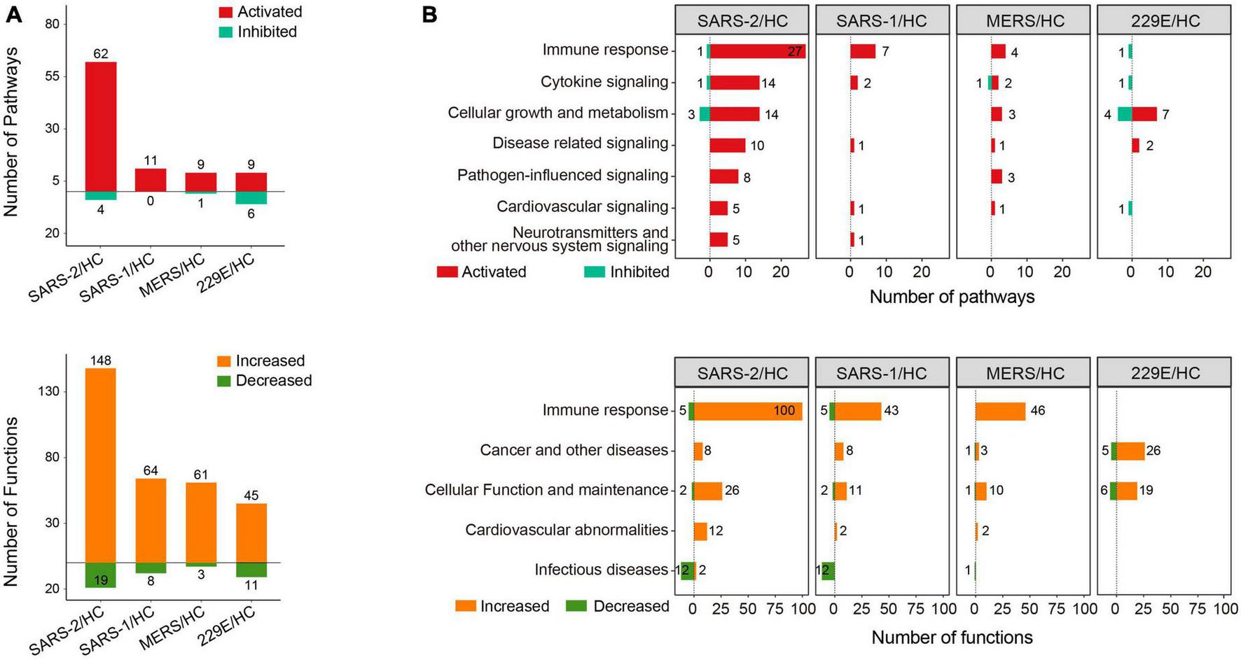 Pathway and function enrichment analysis upon HCoV infections based on IPA. (A) Quantity of the pathways and functional terms enriched in the HCoV-infected groups. (B) Classifications of the pathways and functional terms based on functional characteristics. For IPA analysis, –log (p-value) >1.3 and absolute Z-score >2 were set as the thresholds to identify the significantly up- or downregulated pathways and functional terms.