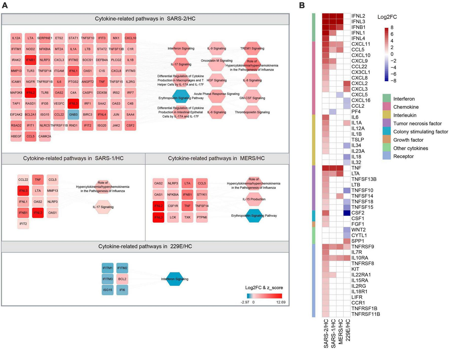 Expression of cytokine-related DEGs in the four HCoV groups. (A) Networks of the cytokine genes and cytokine-related pathways in each HCoV-infected group. Up- and downregulated genes and pathways are presented in red and blue, respectively. (B) Heatmap of the DEGs encoding cytokines and cytokine receptors in each group.
