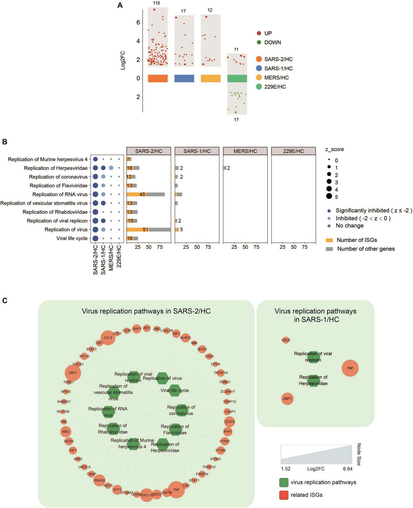 Expression of ISGs in the four HCoV groups. (A) Scatter plot of the ISGs in the four HCoV-infected groups. Up- and downregulated ISGs are presented in red and green, respectively. (B) Virus replication-related functional terms and their corresponding DEGs. ISGs and other genes enriched in each virus replication-related term are presented in yellow and gray, respectively. (C) Networks of the significantly downregulated virus replication-related functions and the correlated ISGs. The size of the circles represents the log2FC for each ISG.