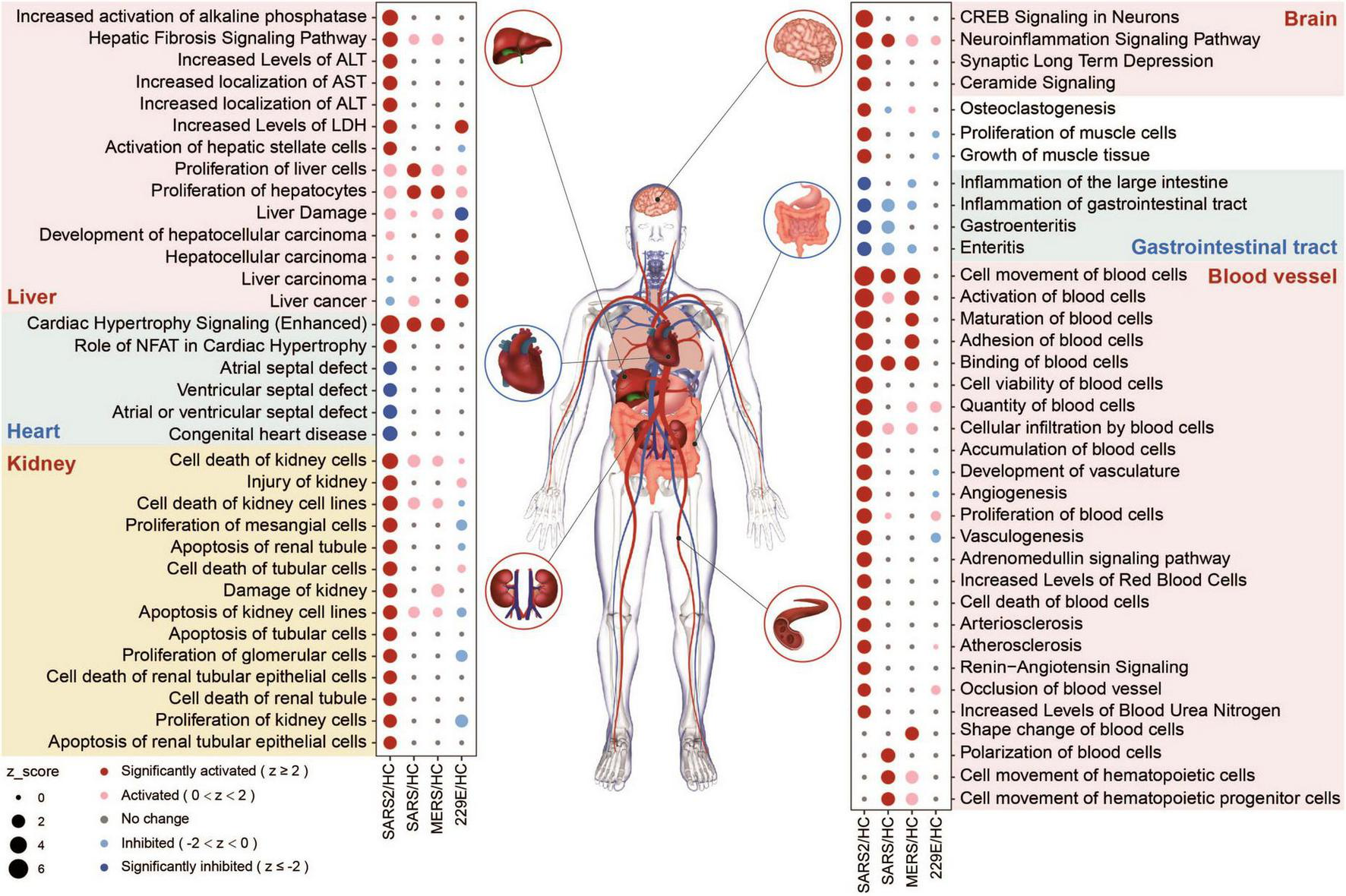Organ-related functional enrichment analysis based on IPA predicted the multi-organ damage in different HCoV infections.