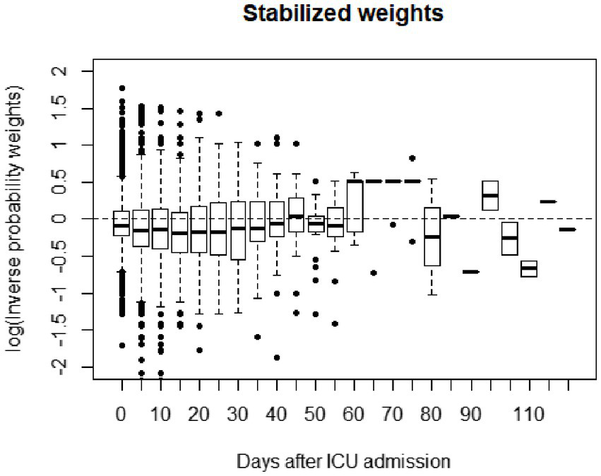 Weight distribution plot for the inverse probability weights that were used to adjust for confounding.