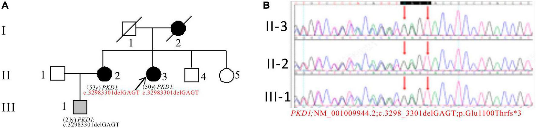 Figure 2. Pedigree diagram and sequencing results of proband B. (A) Pedigree diagram. (B) WES identified a heterozygous deletion mutation in exon 15 (c.3298_3301delGAGT) of the PKD1 gene in the proband (II-3) and affected family members (II-2 and III-1). The mutation sites were indicated by a red arrows panel in panel (B).