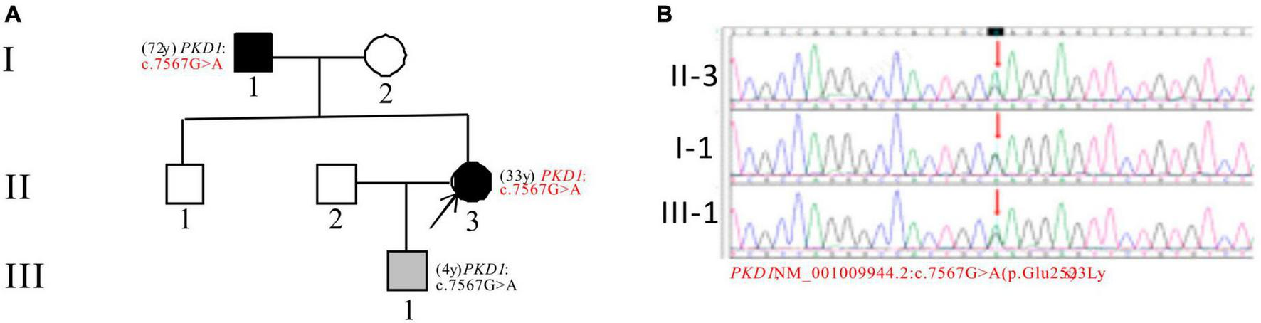 Figure 4. Pedigree diagram and sequencing results of proband D. (A) Pedigree diagram. (B) WES identified a heterozygous missense mutation in exon 19 (c.7567G > A) of the PKD1 gene in the proband (II-3) and affected family members (I-1 and III-1). The mutation sites were indicated by a red arrows in panel (B).