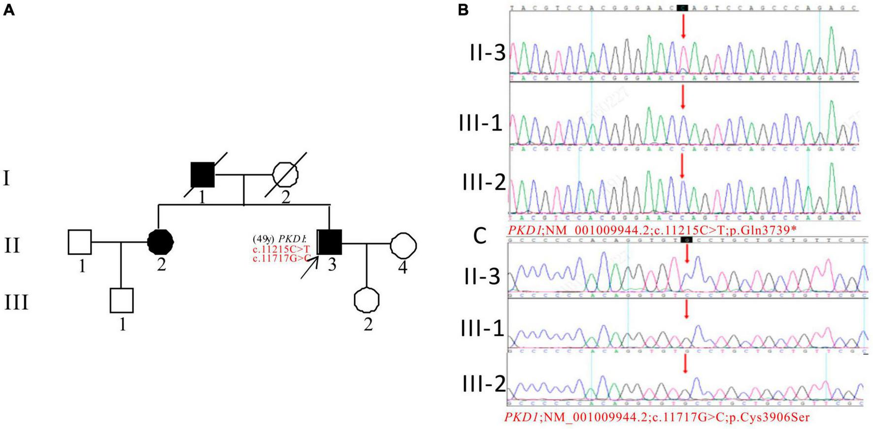 Figure 5. Pedigree diagram and sequencing results of proband E. (A) Pedigree diagram. The WES identified a heterozygous nonsense mutation in exon 39 (c.11215C > T) (B) and a heterozygous missense mutation (c.11717G > C) in exon 43 (C) of the PKD1 gene in the proband, and the results of family members (III-1 and III-2) were displayed. The mutation sites were indicated by a red arrows in panels (B,C).