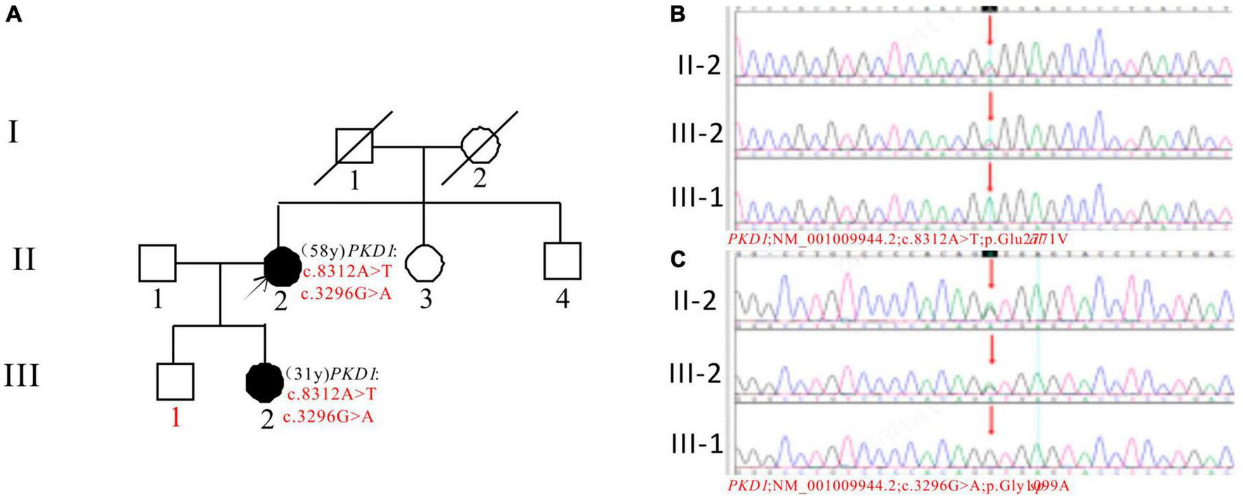 Figure 1. Pedigree diagram and sequencing results of proband A. (A) Pedigree diagram. The WES identified a heterozygous missense mutation in exon 23 (c.8447T > C) (B) and a heterozygous missense mutation in exon 15 (c.4247T > G) (C) of the PKD1 gene in the proband (II-1) and affected family members (I-1 and III-1). The mutation sites were indicated by a red arrows in panels (B,C).