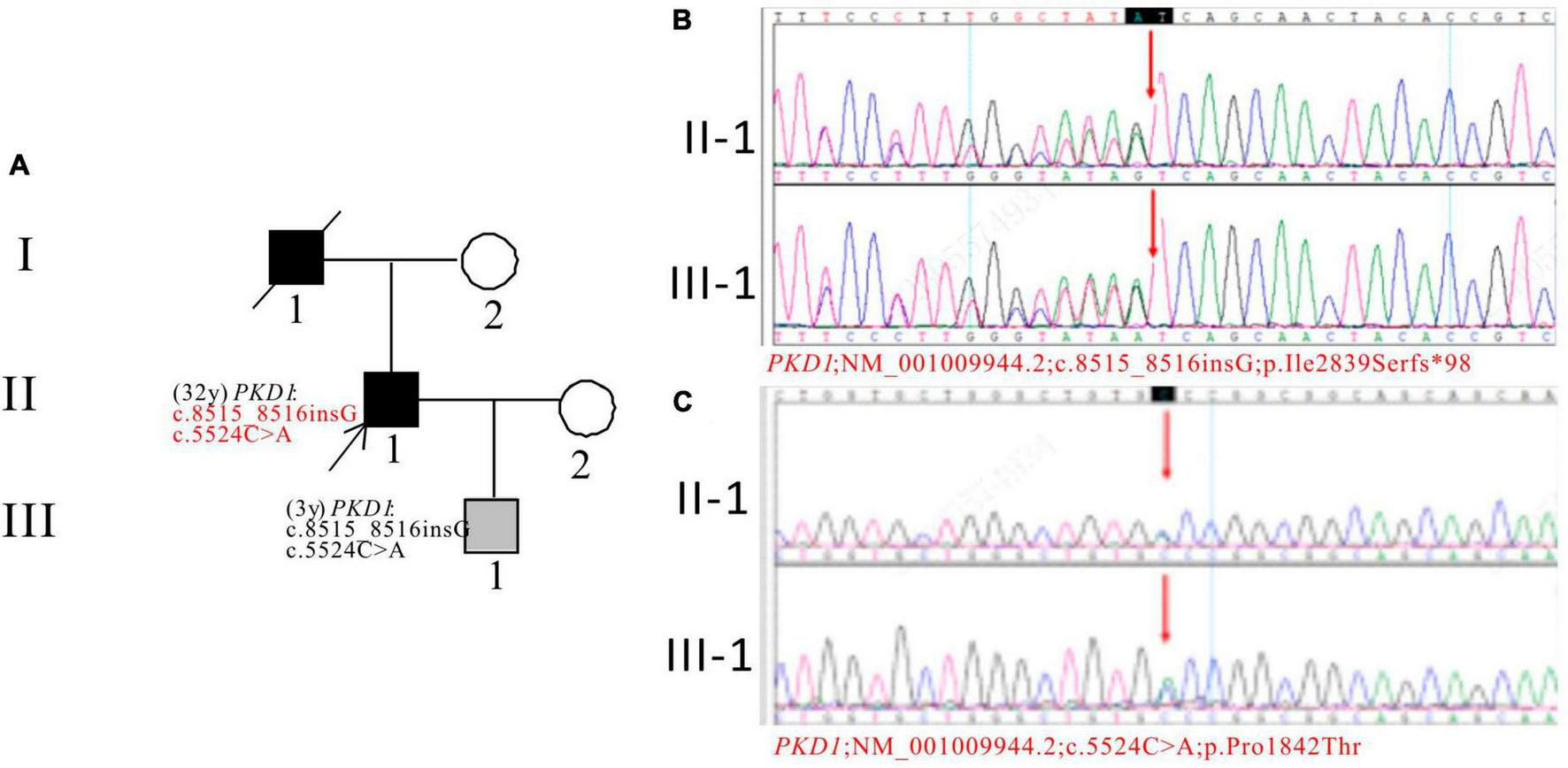 In Pedigree H, WES analysis revealed a pathogenic and an uncertain mutation in the PKD1 gene (Supplementary Table 1). Specifically, a heterozygous frameshift mutation in exon 23 of the PKD1 gene was identified: c.8515_8516insG (p.Ile2839Serfs*98), which has been indicated as pathogenic by the ACMG guidelines. Another heterozygous missense mutation was detected in exon 15 of PKD1: c.5524C > A (p.Pro1842Thr), which has been indicated as having uncertain significance according to the ACMG guidelines. At present, there are no reports on their pathogenicities. The proband’s father was an ADPKD patient who passed away at the age of 50. Sanger sequencing confirmed that the son of the proband (III-1) (3 years old) carries the mutations and is an apparently normal mutation carrier (Figure 8).