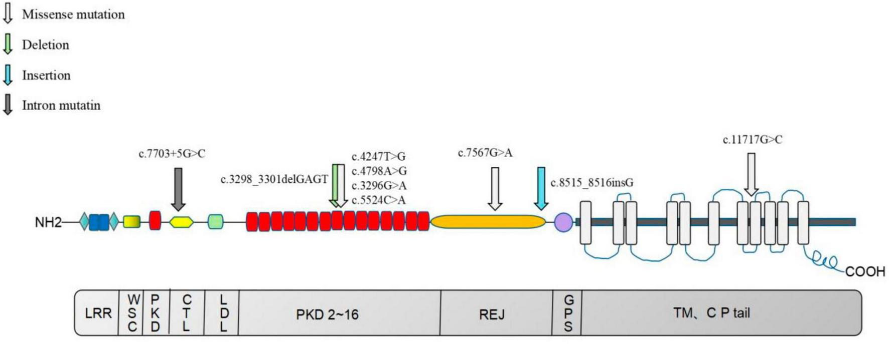 Figure 9. Distribution map of nine newly identified PKD1 mutations in eight ADPKD patients. The upper section of the image illustrates the PC-1 domain, which includes 11 transmembrane domains, a large extracellular N-terminal domain, and a short intracellular C-terminal tail region. The lower section of the image depicts the coding region of the PKD1 gene. LRR, Leucine-rich repeats; PKD, PKD functional area; CTL, C-type lectin motif, C-type phytohemagglutinin region; LDL, LDL-A like domain, rich in cysteine low-density lipoprotein receptor region; REJ, receptor egg jelly, the homologous region of sea urchin egg glue receptor; GPS, G-proteolytic site; TM, transmembrane, transmembrane domain; CP tail, cytoplasmic tail.