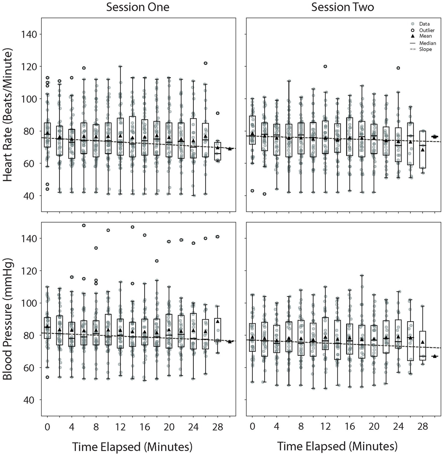 Physiological change throughout the VR sessions. Heart rate (top) and blood pressure (bottom) throughout the VR sessions. Time 0 represents the start of the session. The average duration of the sessions was 24 ± 2.62 min. The mean of the data points per time period is represented by a triangle symbol. VR, virtual reality.