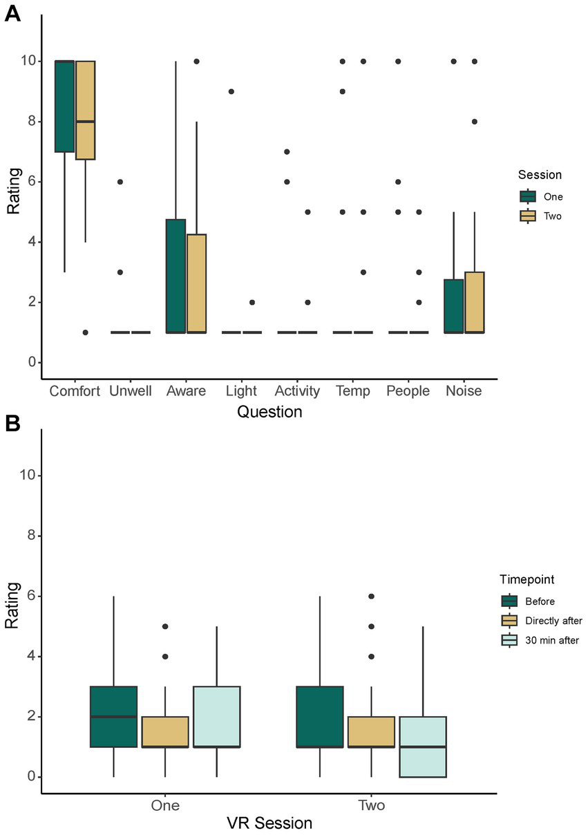General Awareness and Pain Scores. General comfort and awareness scores (A) as reported via questionnaire following VR sessions one and two. Pain scores (B) as reported using the Numeric Rating Scale immediately before, directly after, and 30 min after each VR session. VR, virtual reality.