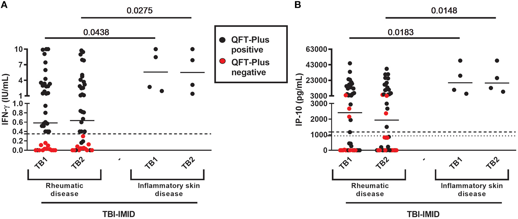 QFT-Plus and IP-10-based assay results in TBI-IMID stratified according to the type of IMID disease. (A) IFN-γ levels in response to TB1 and TB2 stimulation expressed as IU/mL; (B) IP-10 levels in response to TB1 and TB2 stimulation expressed as pg/mL. ELISA was performed in plasma. The horizontal lines represent the median; statistical analysis was performed using the Mann–Whitney test. IFN, interferon; IP-10, IFN-γ-inducible protein 10; QFT-Plus, QuantiFERON-TB-Plus; TBI, TB infection; IMID, immune-mediated inflammatory disease.