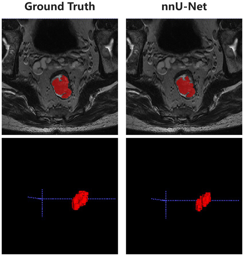 The mean DSC, HD95 and ASD were 0.857 ± 0.041, 2.186 ± 0.956, and 0.562 ± 0.194 mm, respectively. The nomogram, which incorporates MR T-stage, CEA, CA19-9, and Radscore, exhibited a higher area under the ROC curve (AUC) compared to the Radscore and subjective evaluation in the training set (0.921 vs. 0.903 vs. 0.662). Similarly, in both external validation sets, the nomogram demonstrated a higher AUC than the Radscore and subjective evaluation (0.908 vs. 0.735 vs. 0.640, and 0.884 vs. 0.802 vs. 0.734).